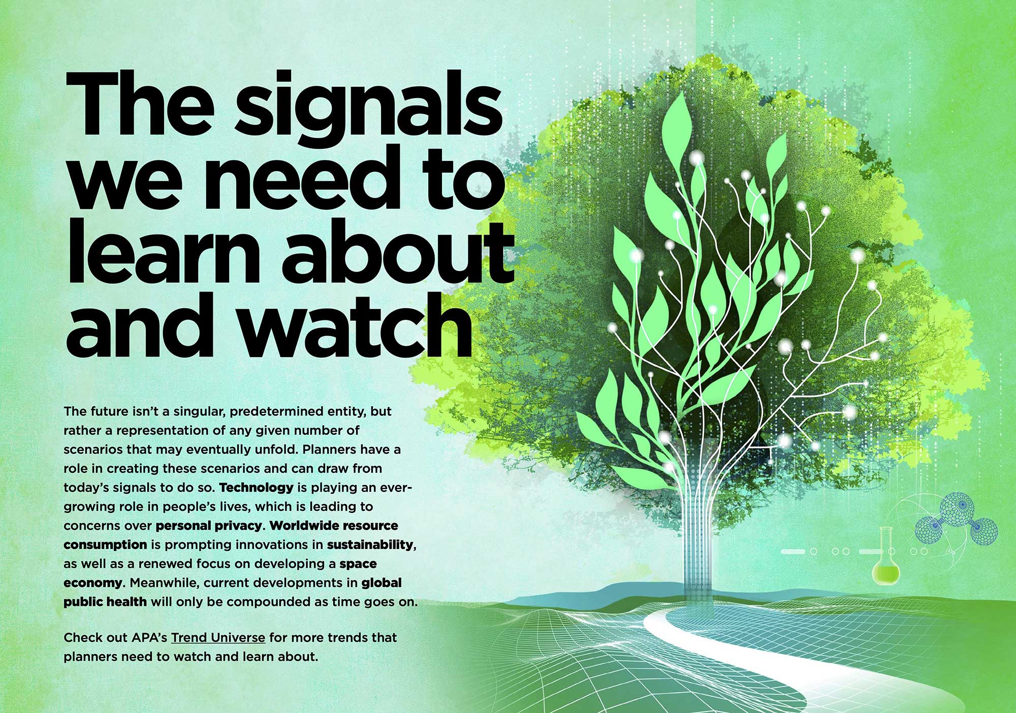 Stephanie Dalton Cowan illustrated the cover and a series of openers for the American Planning Association’s 2026 Trend Report. Stephanie’s eye catching illustrations represent different issues impacting the future of community planning.