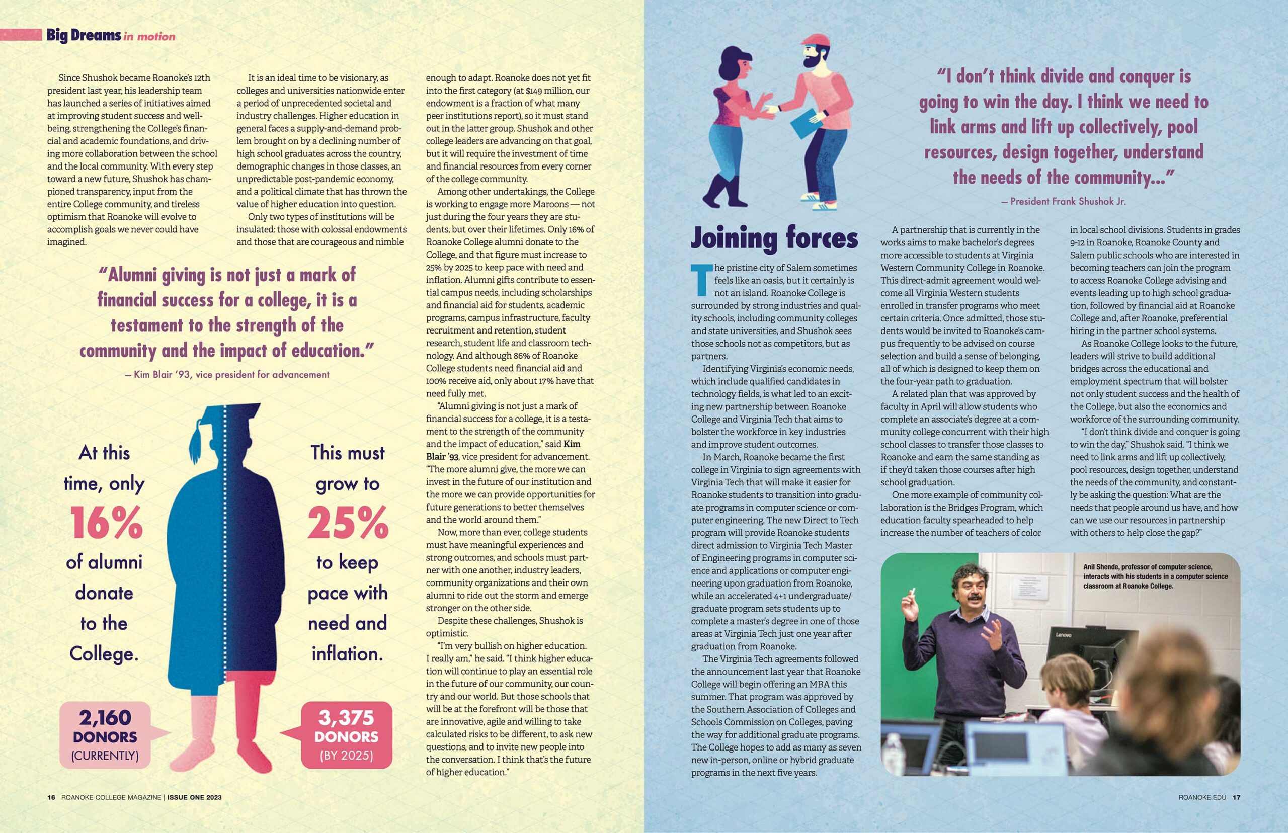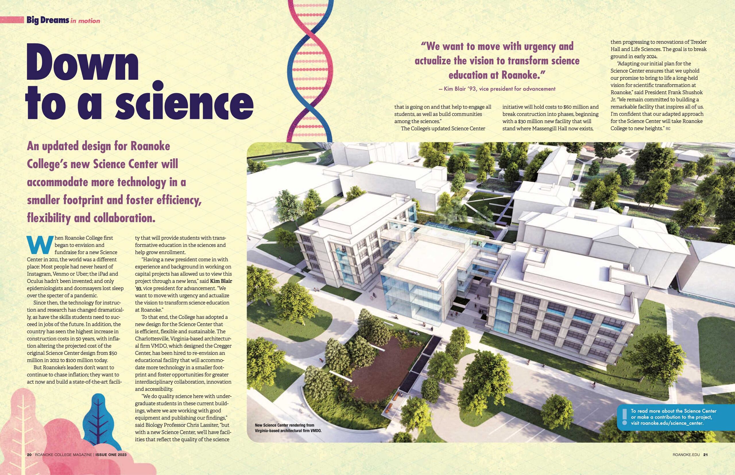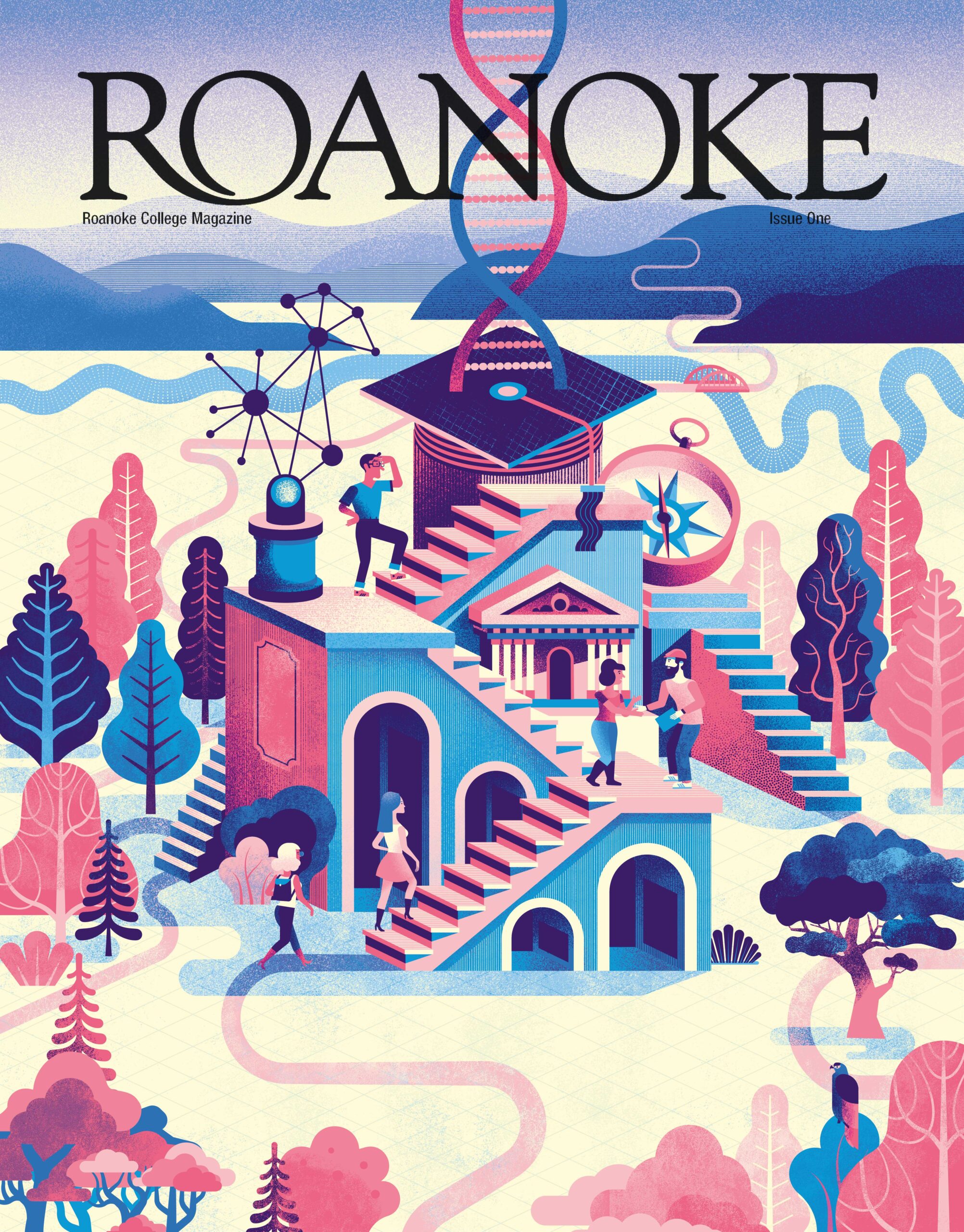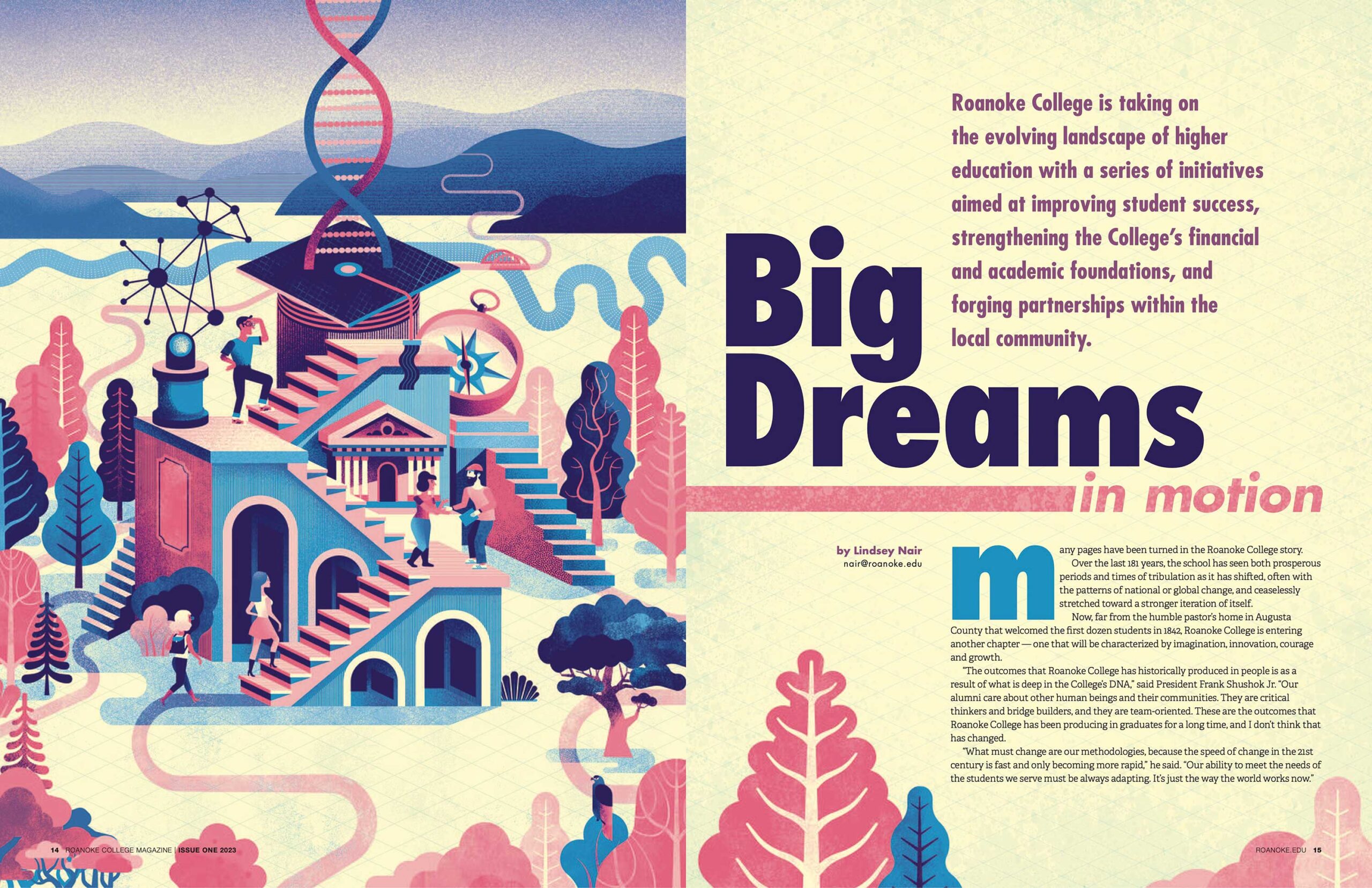 Gwen Keraval illustrated Roanoke College Magazine’s Spring 2023 cover story, “Big Dreams in Motion”. Anticipating a new era of societal and industry challenges, Roanoke initiatives aim to position the college for success in the evolving landscape of higher education.