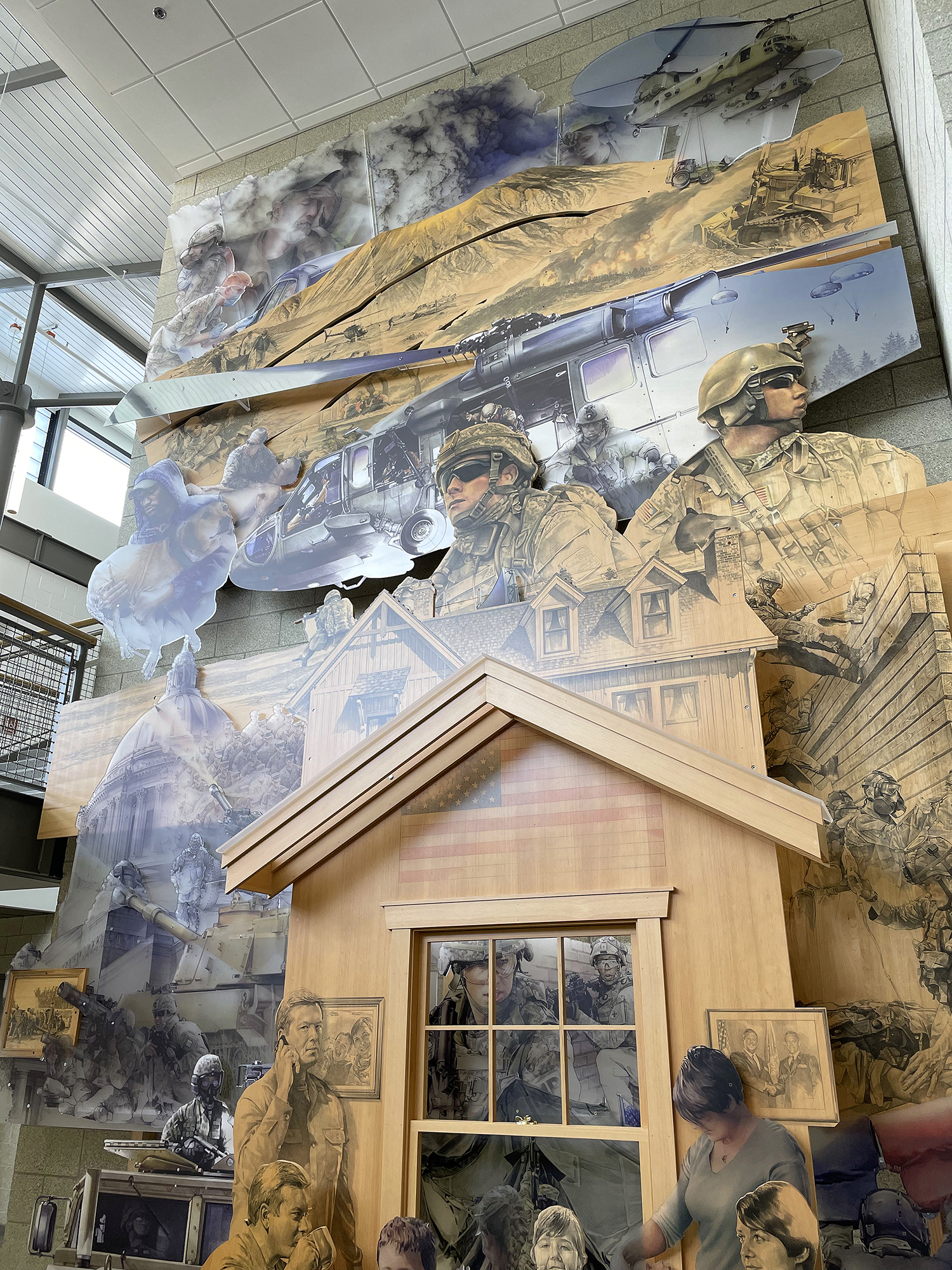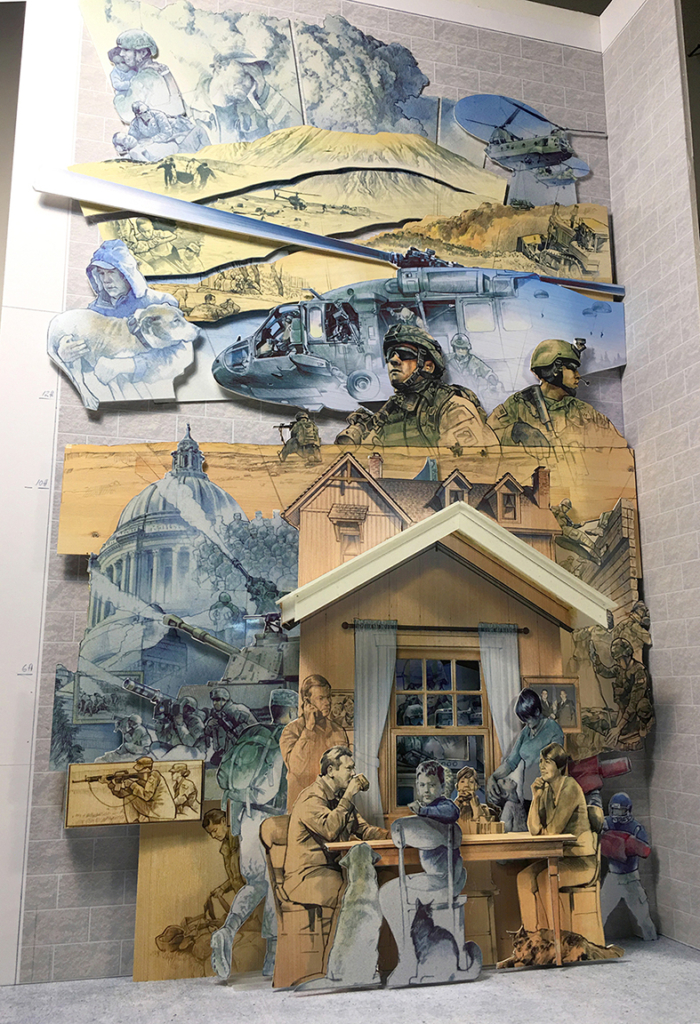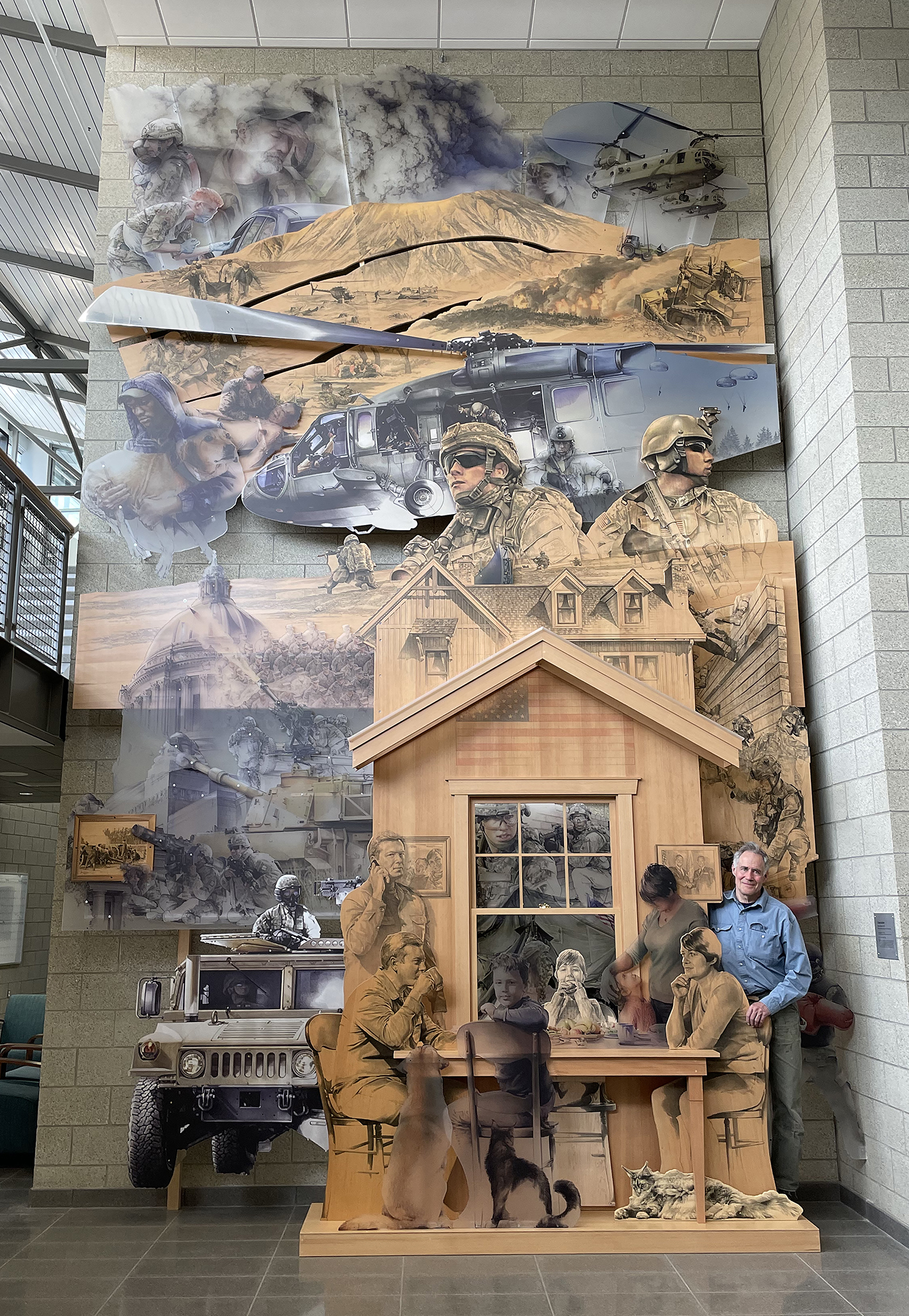 Bruce Morser was commissioned to create a full-scale installation for the Washington State National Guard. The installation scales the facility’s full wall at 25 feet tall and 15 feet wide and is made from wood and acrylic panels.