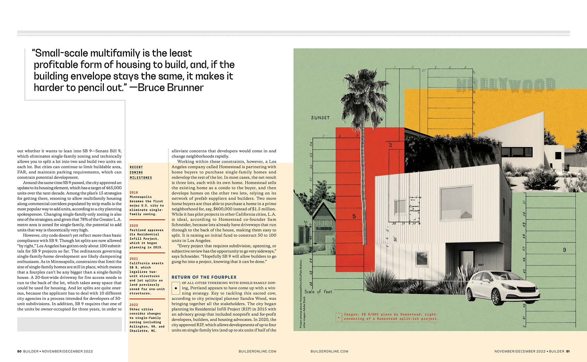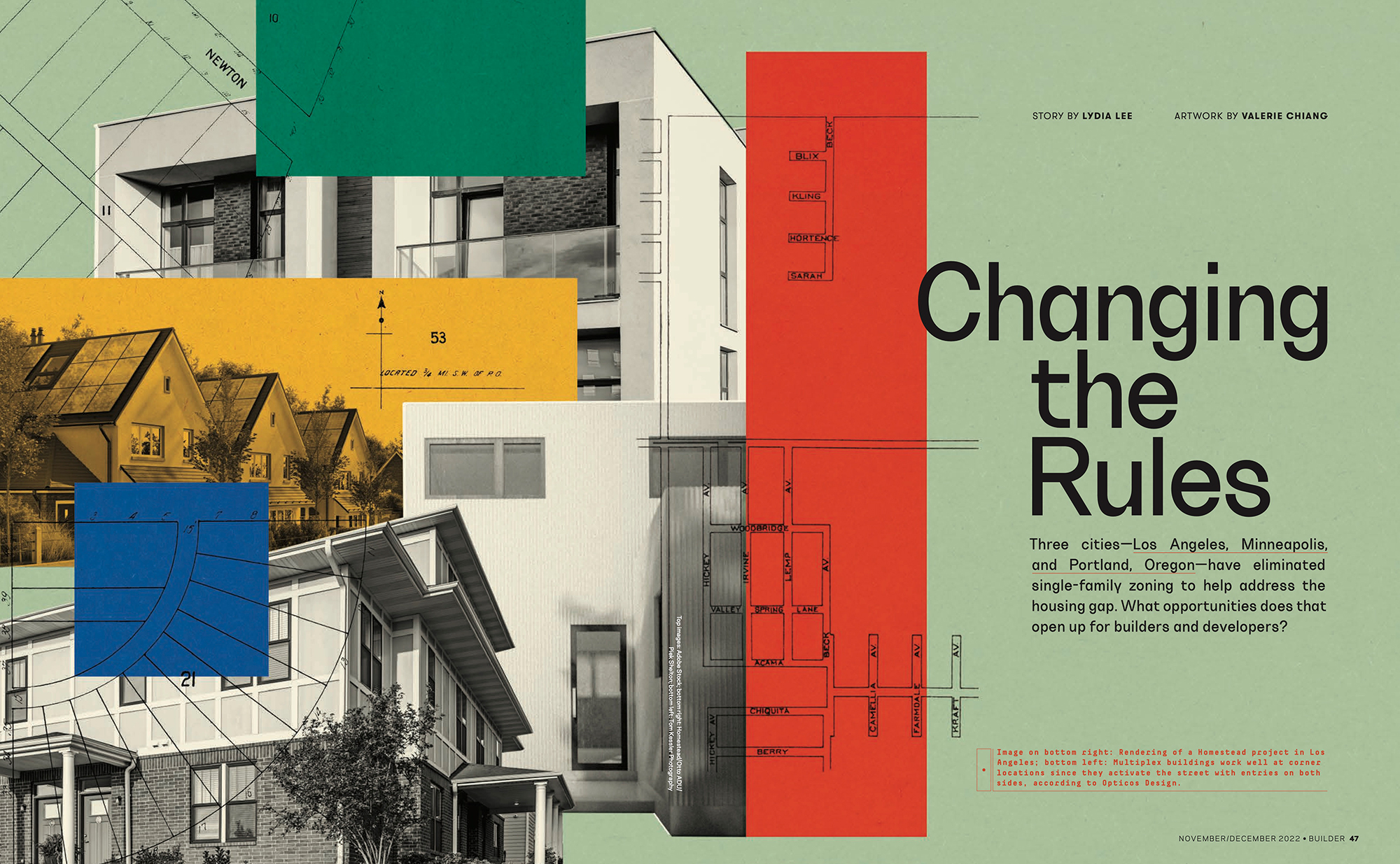 Valerie Chiang created a series of photo-collage illustrations for the feature “Changing the Rules” in the Nov/Dec issue of Builder Magazine, exploring the results of eliminating single-family zoning in cities to address the housing gap. The issue was just awarded a Neal Award for best overall art direction. Congratulations to Art Director Alice Ashe!