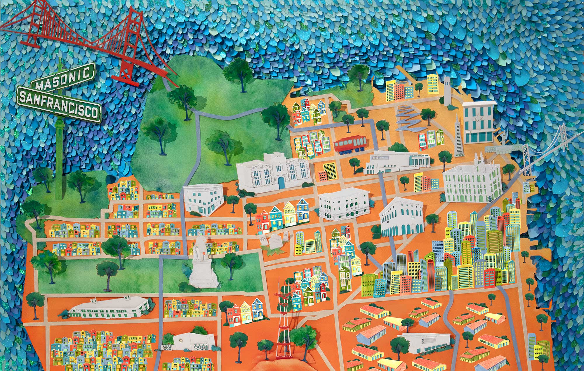 Pushart illustrated the cover of California Freemason’s Fall 2025 issue with a paper sculpture of San Francisco architecture. They also illustrated a walking tour map of all the Freemason buildings in the Bay Area for a special fold-out spread.