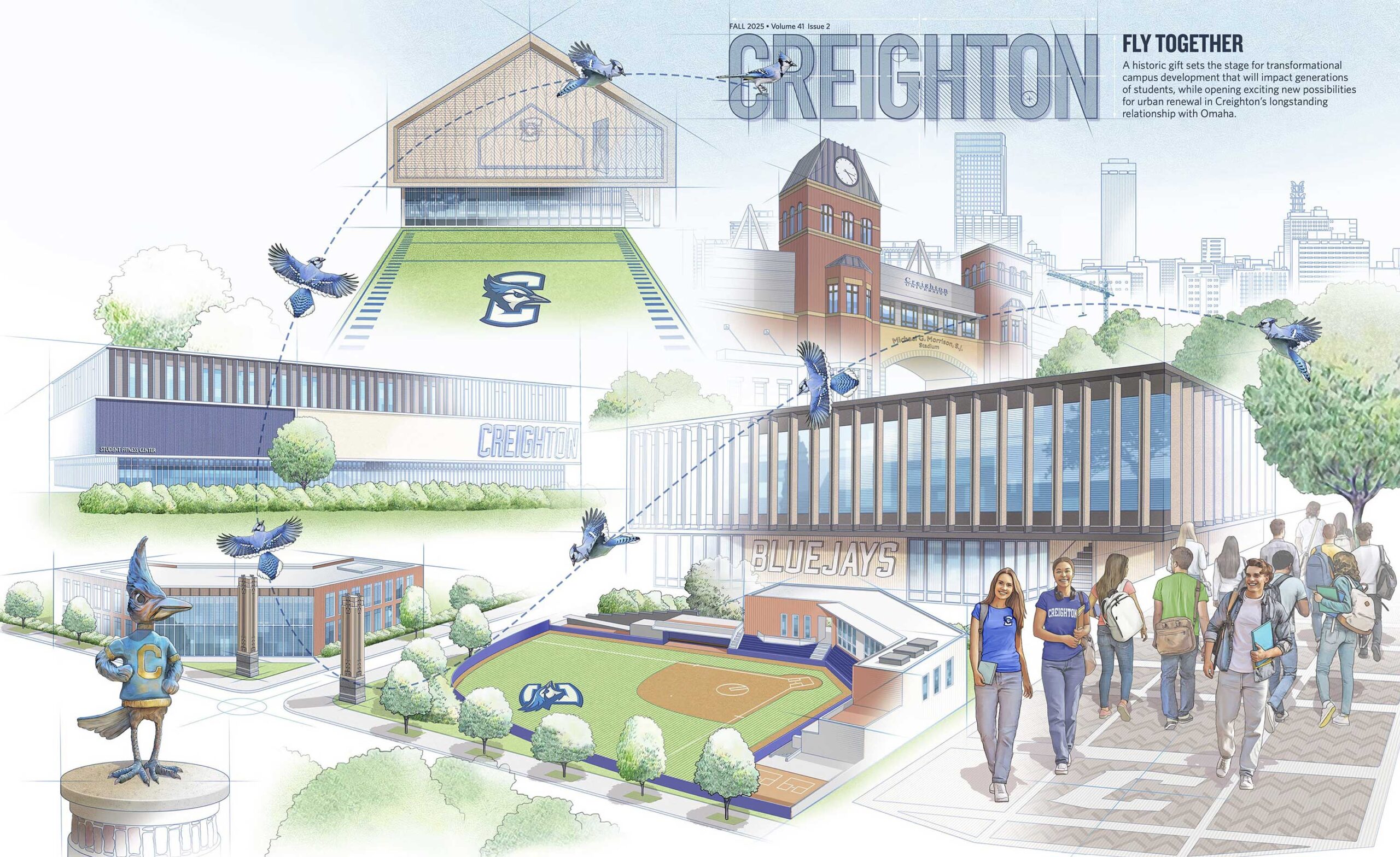 Peter Bull illustrated the Fall 2025 issue of Creighton Magazine, combining skills in illustrating architecture, maps, people, and lettering for a front and back cover that imagines the future of the university’s campus. The Fly Together initiative will reimagine fitness, recreation, athletics and community access for the next generation of students.