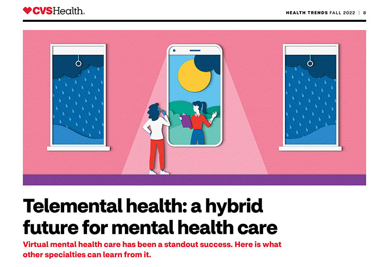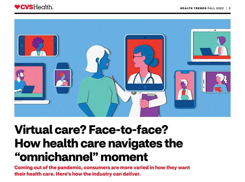 Zara Picken illustrated the Fall 2022 CVS Health Trends report, including a cover illustration and header images for five articles. The report discusses the “Rise of Omnichannel Care” and how to navigate the increasingly hybrid state of healthcare.