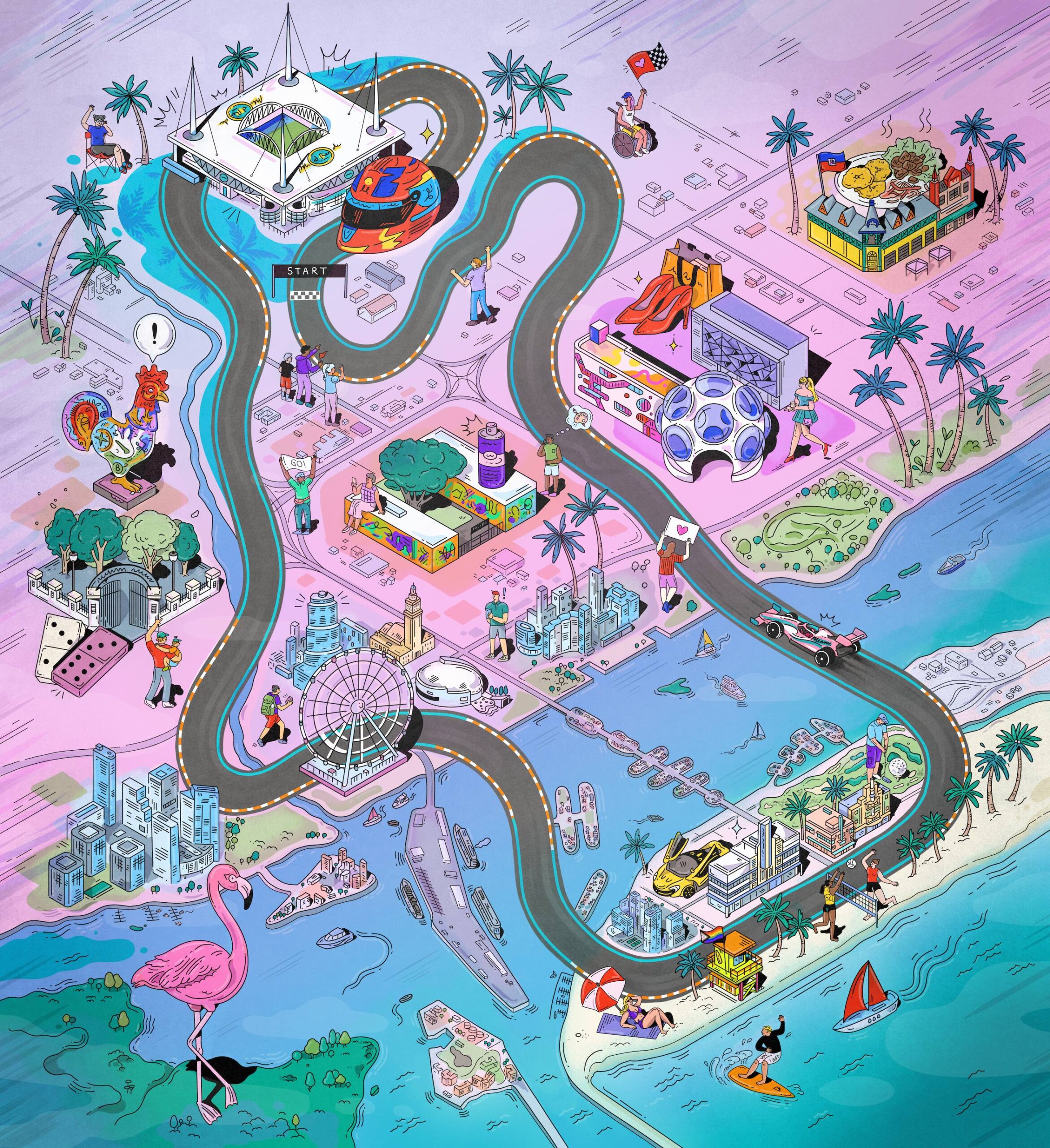 Ahead of this weekend’s Formula One Miami Grand Prix, Kathleen Fu illustrated a circuit map for Visit Miami Tourism, highlighting fun things to do in the area leading up to the race. We’ve included a window into Kathleen’s creative process by posting some of her development work. Scroll down to see spots of Miami landmarks like Domino Park in Little Havana.