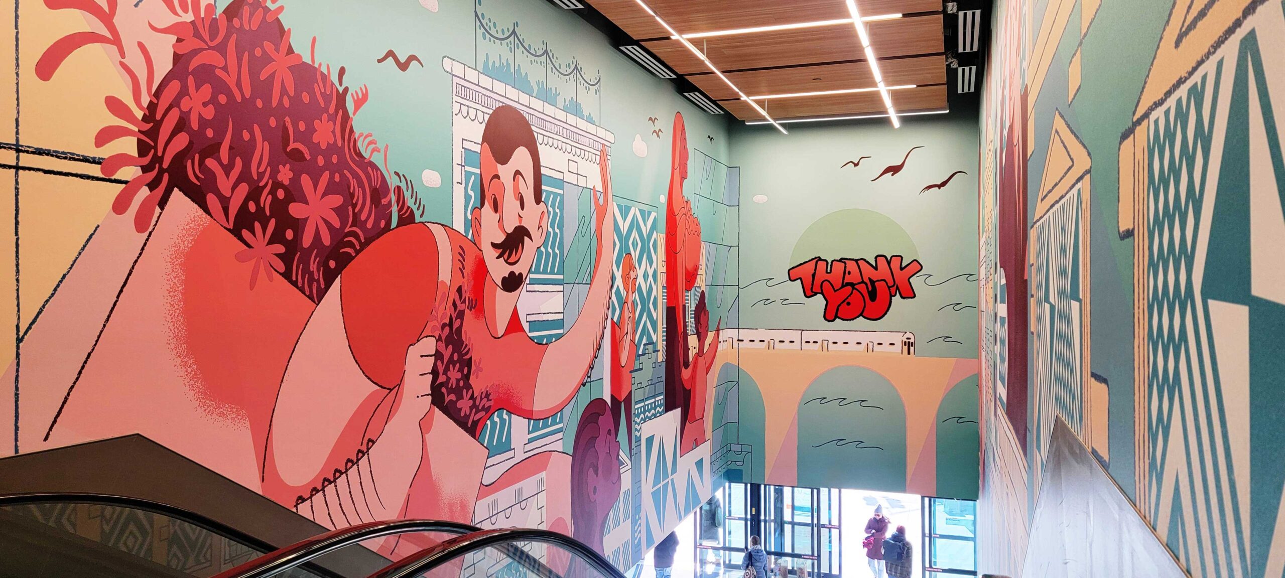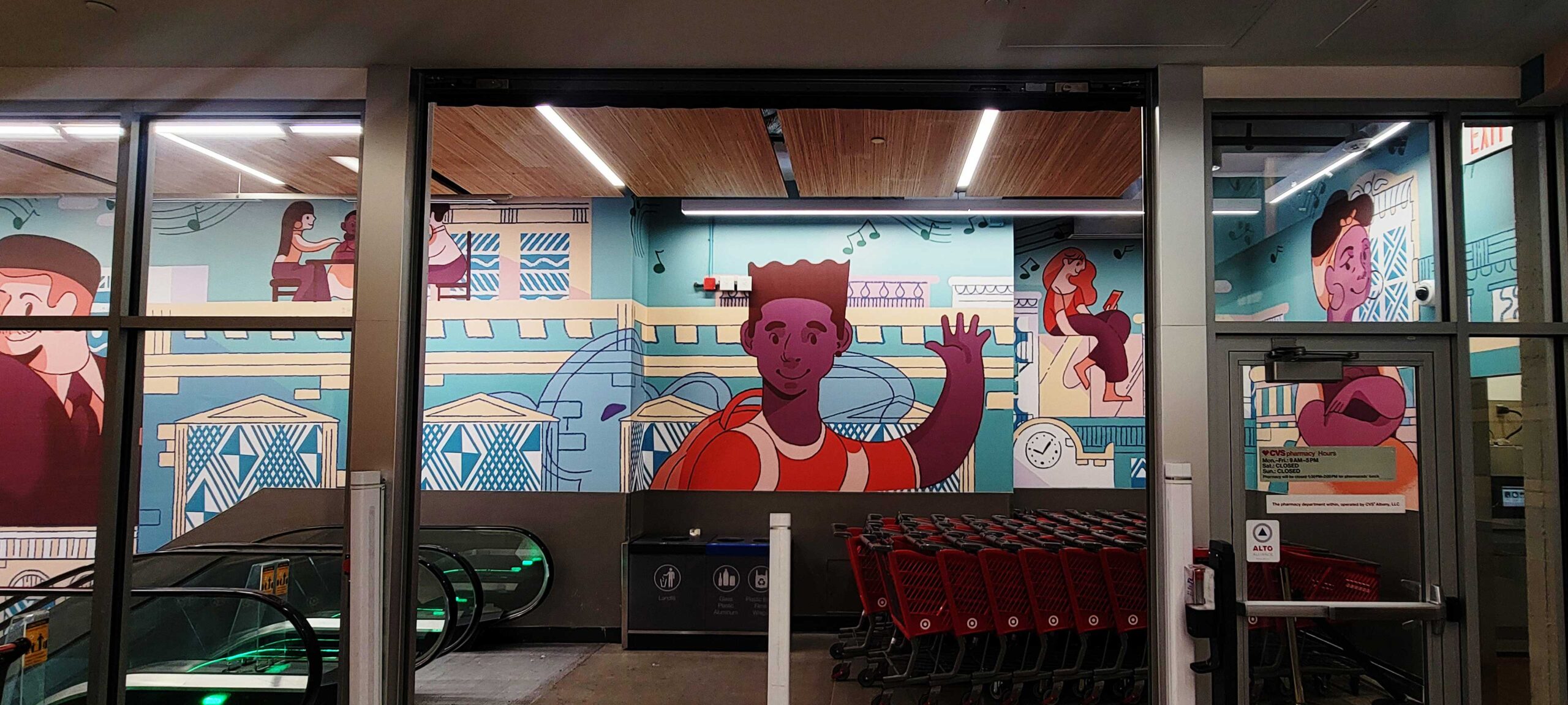 NYC-based artist Islenia Mil was commissioned to design a mural for the recently opened Target location on 125th Street in Harlem. Wrapping around the lobby entryway, the mural greets visitors upon entering the store and represents the vibrant Harlem community. See some of Islenia’s sketch-to-finish work process below.