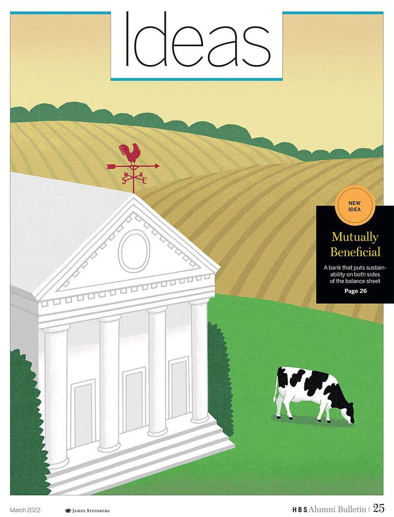 James Steinberg was commissioned by Harvard Business School to illustrate the section cover for their “Ideas” in their Alumni Bulletin. This section featured “Savings and Loan: Reinventing the mutual bank around the modern era of community-based agriculture and values-based banking.”