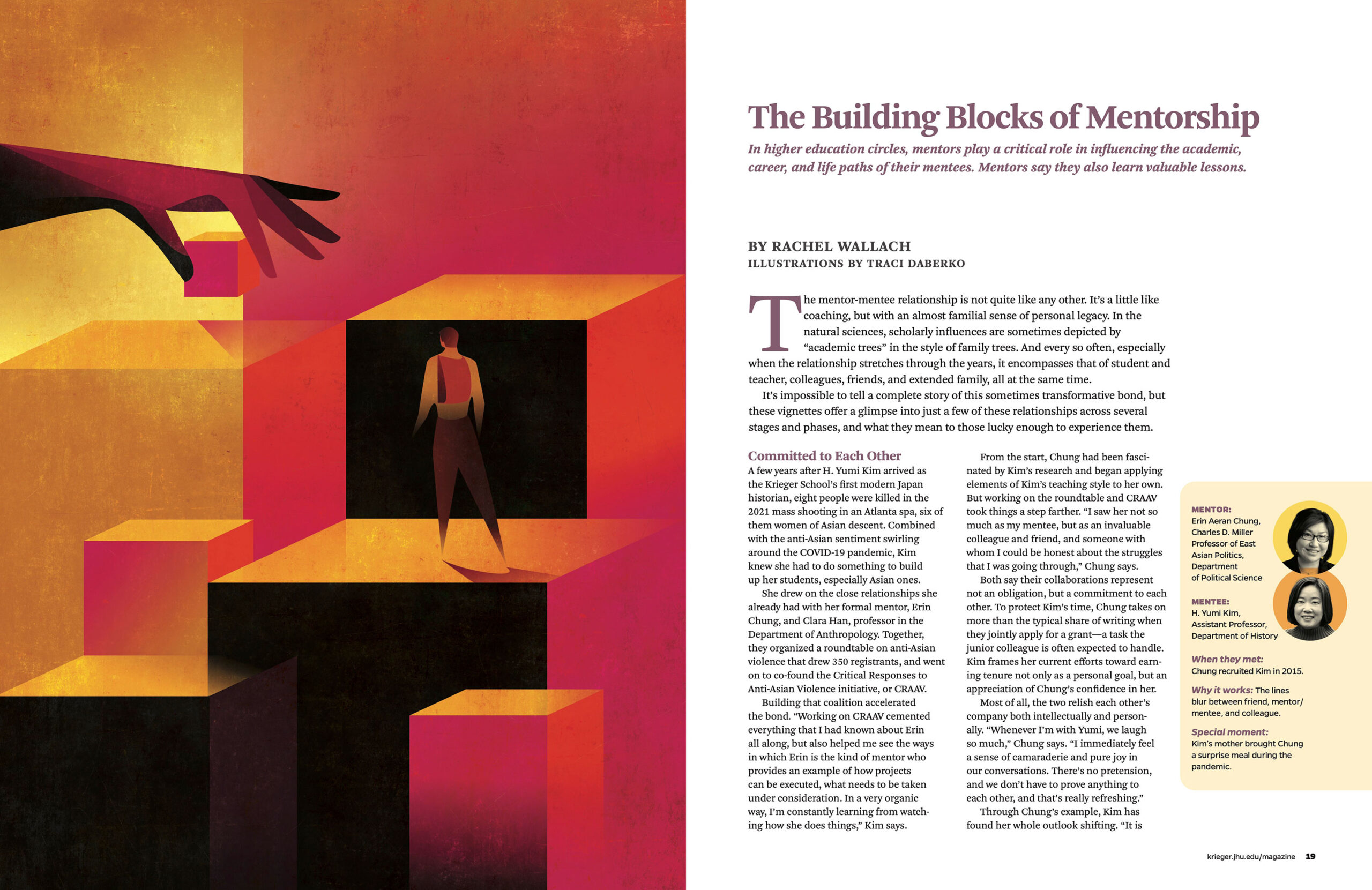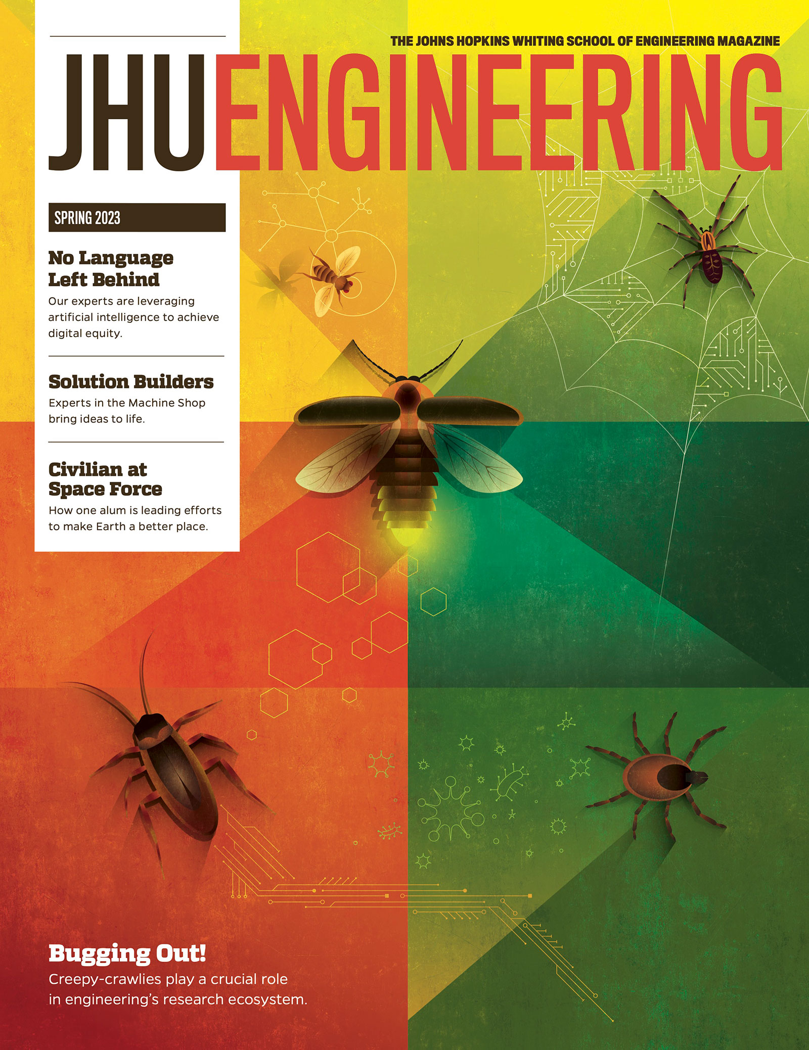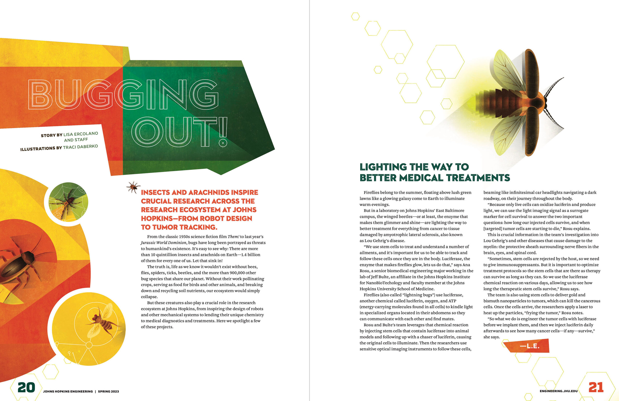 Traci Daberko recently illustrated two JHU Spring 2023 cover stories for the Krieger School of Arts & Sciences and the Whiting School of Engineering.