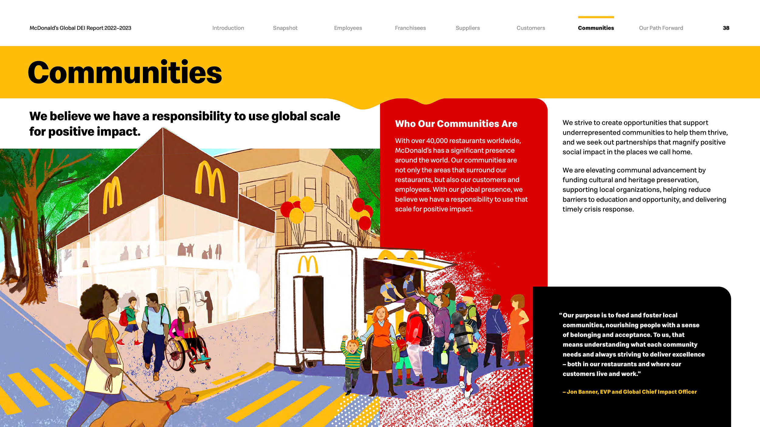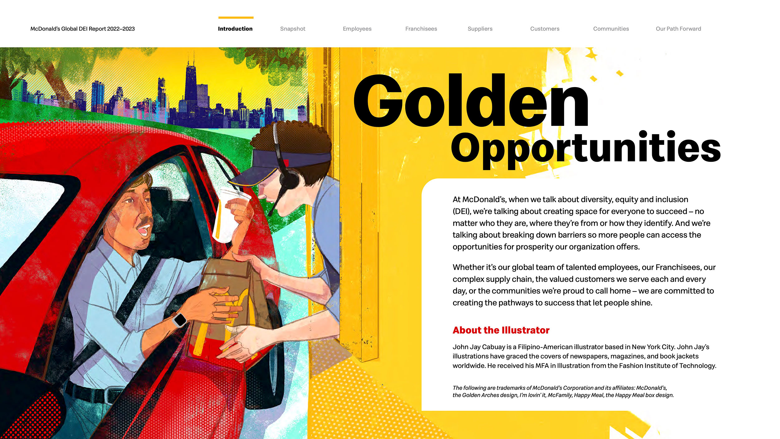 John Jay Cabuay was commissioned by Avila Creative to illustrate the McDonald’s 2022-2023 Global DEI (Diversity, Equity, and Inclusion) Report – A project which recently won in the 2023 GDUSA Awards!