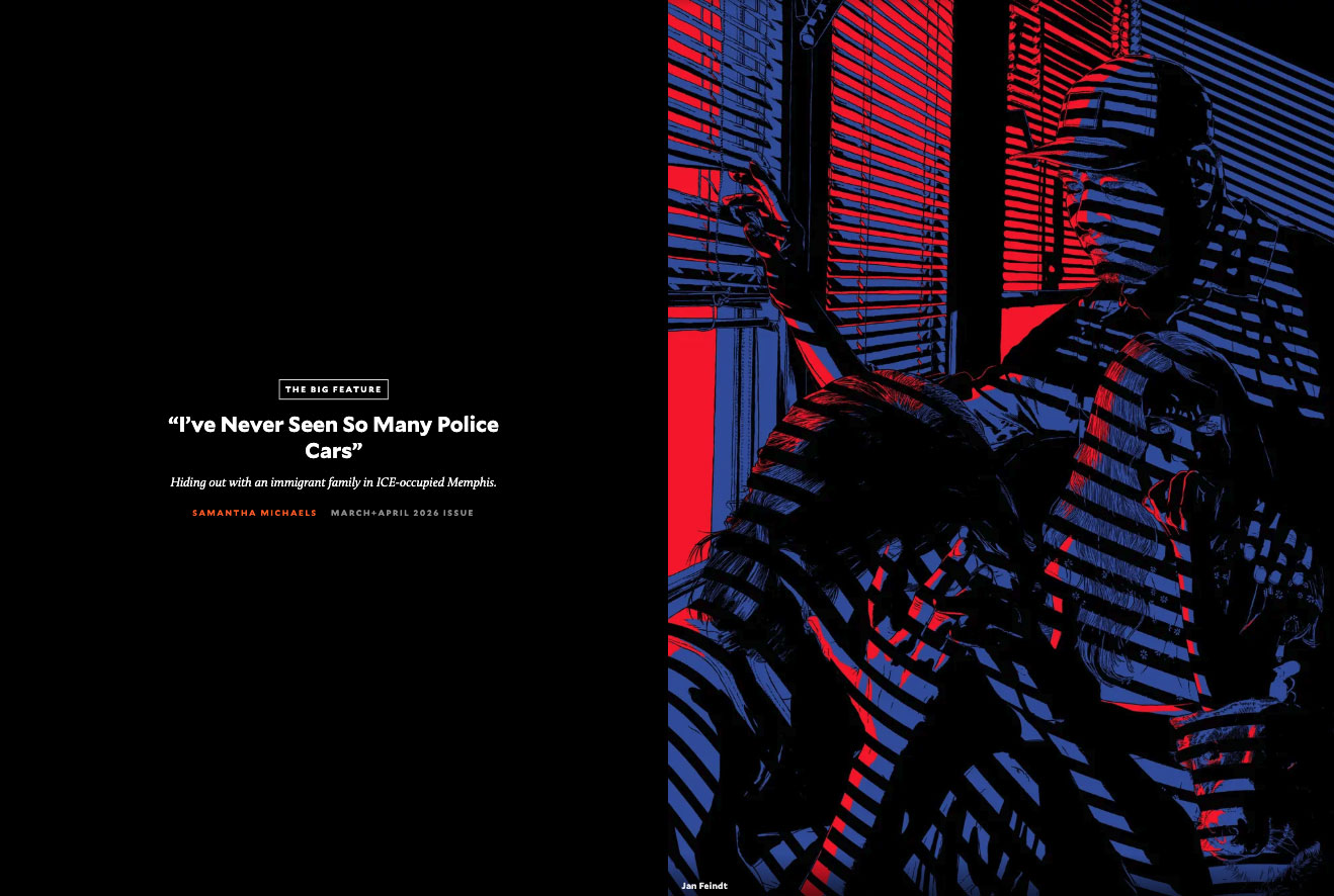 Jan Feindt illustrated a story in the March-April issue of Mother Jones Magazine: House Arrest. The story describes the impact of immigration operations on the Memphis community, including the perspective of an immigrant family hiding in their home.
