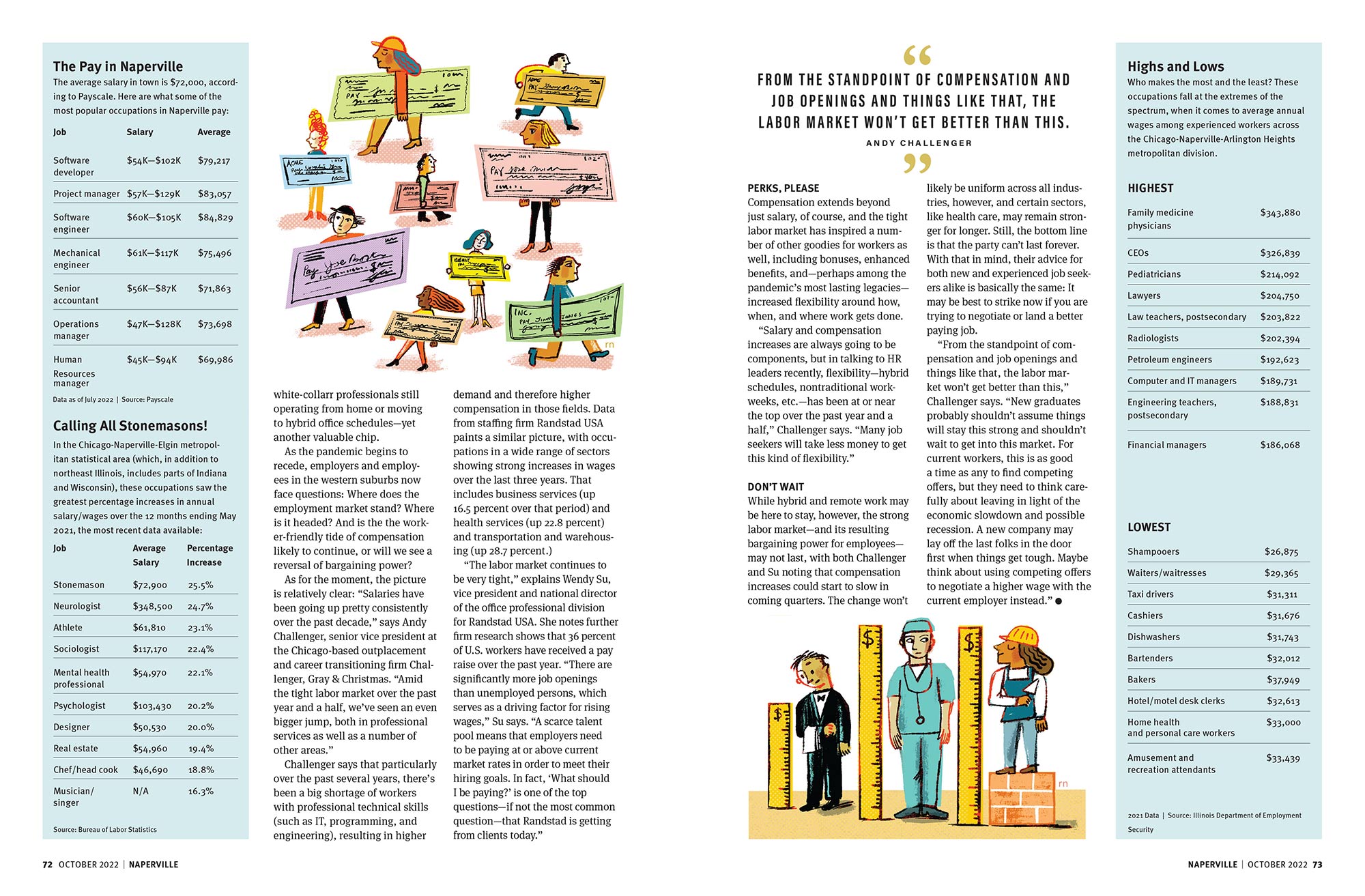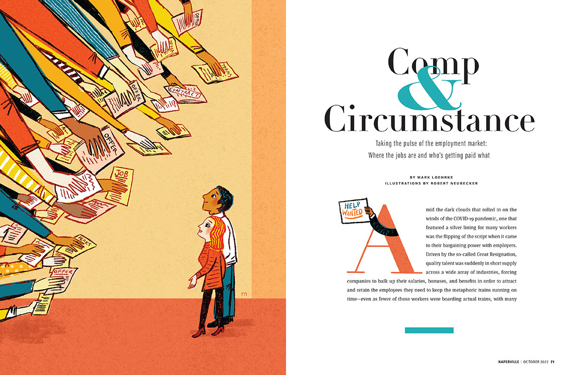 Robert Neubecker illustrated a story in Naperville Magazine’s October issue, about the current state of the job market and how salaries compare.