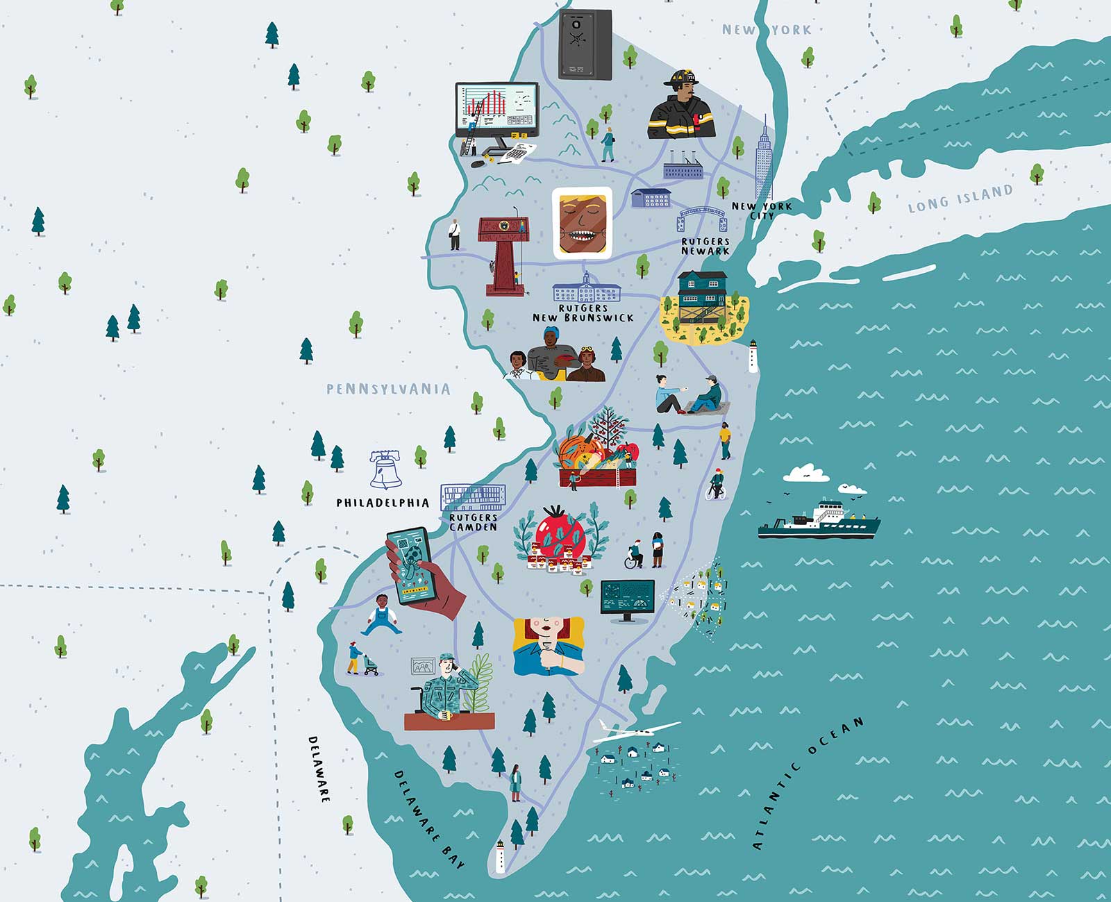 Alex Foster worked with Rutgers University to illustrate an interactive map of New Jersey, highlighting the positive impact that Rutgers has on health, safety, community, and environment throughout the state. In addition to the illustration, Alex created the font for the map with his hand lettering. The map can be seen on their website as well as on billboards throughout the state.