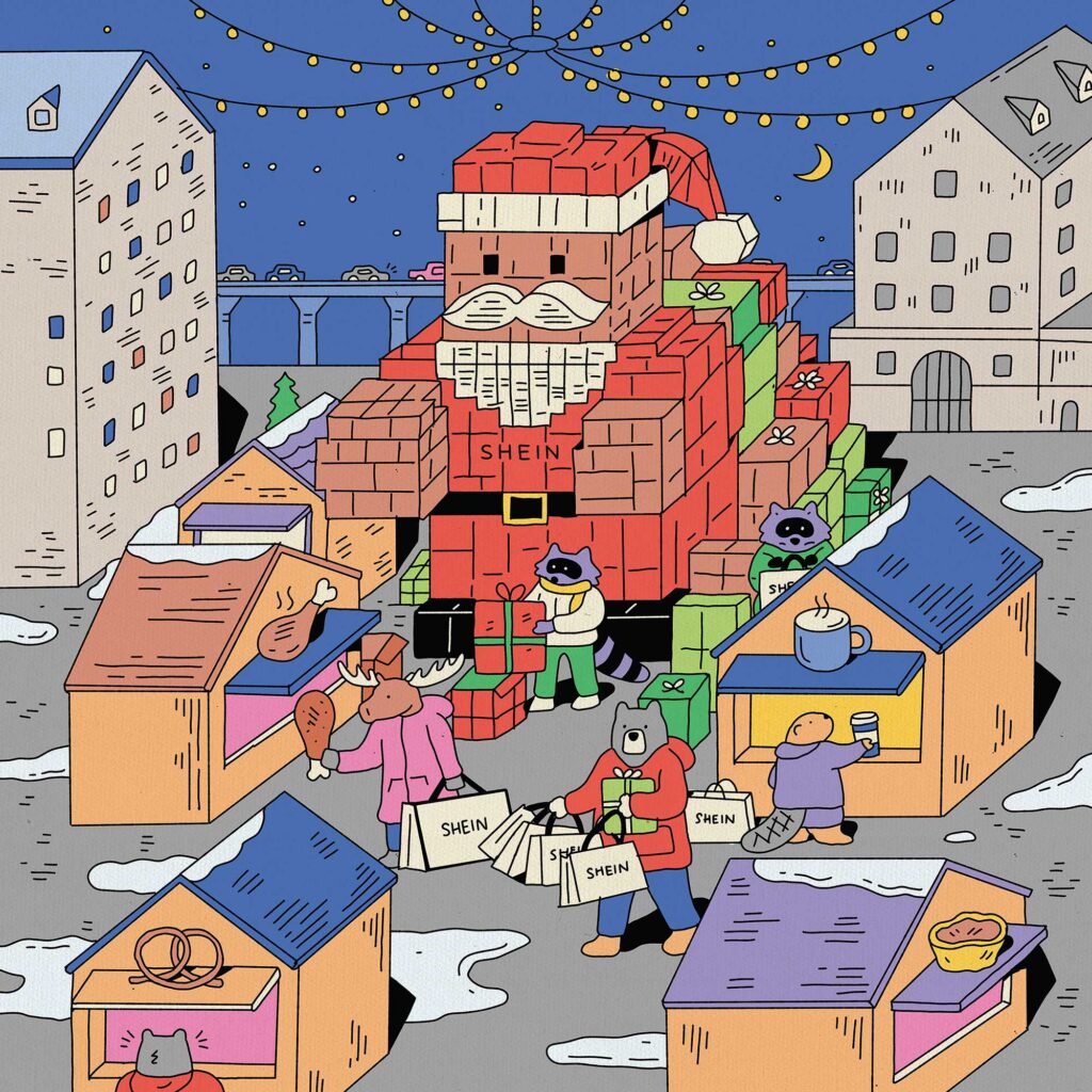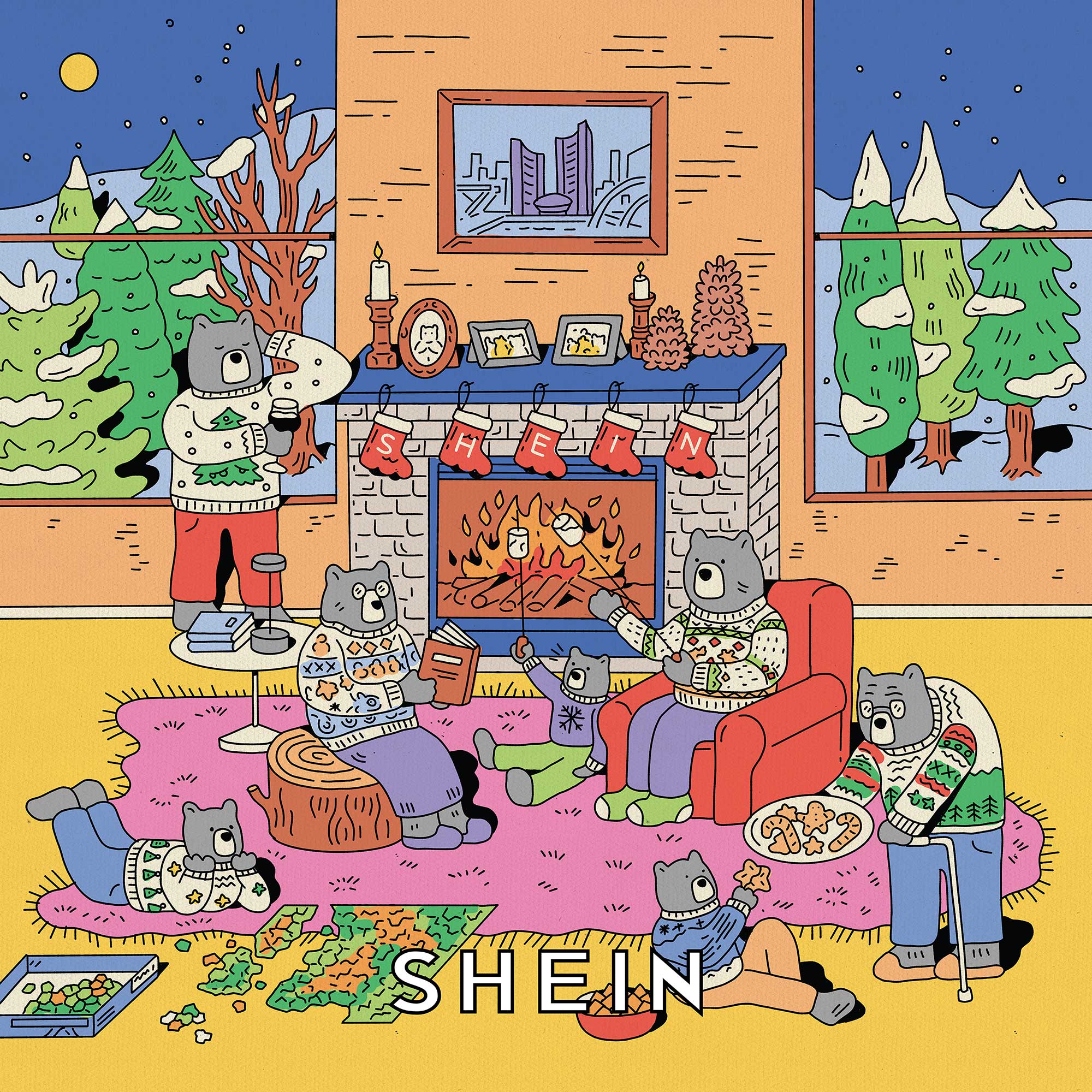 Toronto-based illustrator Kathleen Fu collaborated with e-commerce platform SHEIN Canada on a series of festive scenes for their holiday campaign. Her illustrations, featuring characters inspired by Canadian wildlife, have been transformed into 10 holiday murals in Toronto’s Distillery District. The artwork also appears on a new collection of Shein merchandise that includes phone and iPad cases, wallets, and tote bags.