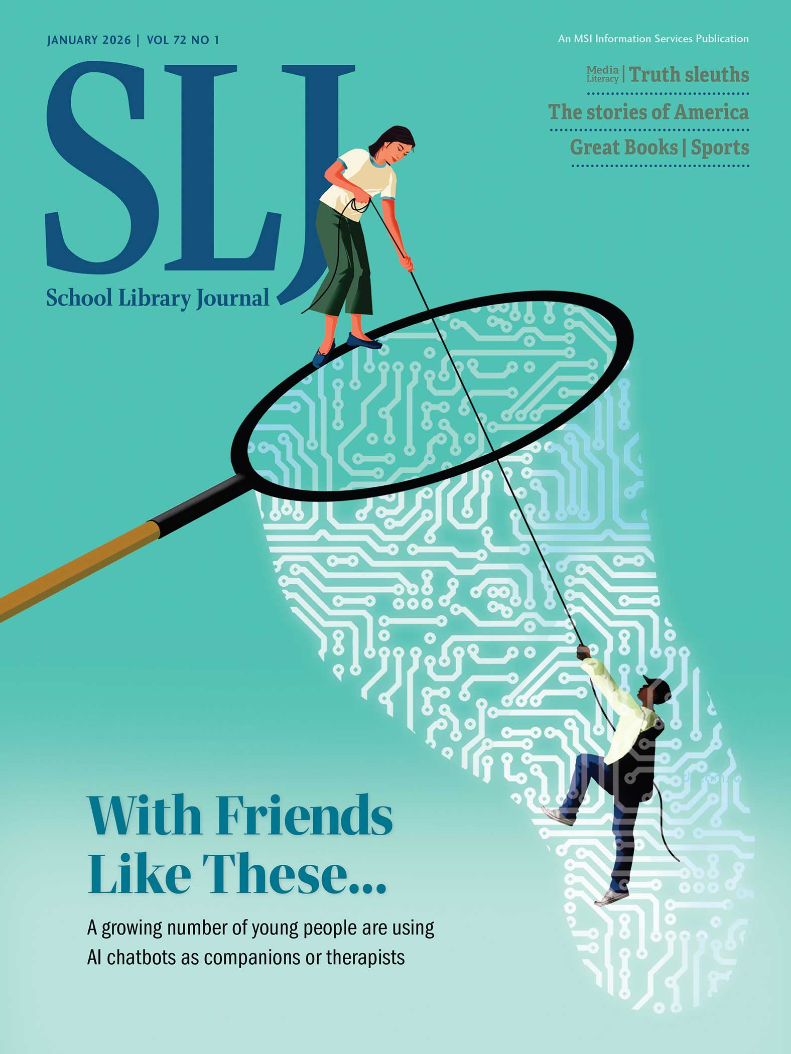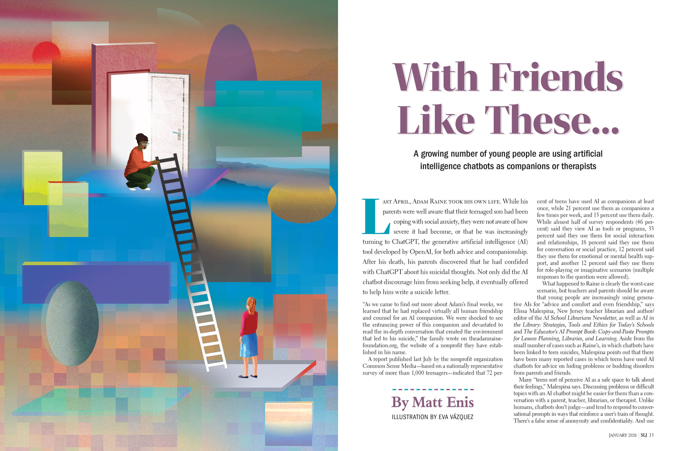 Eva Vazquez illustrated the January issue of School Library Journal about the impact of young people increasingly using AI chatbots as companions or therapists.