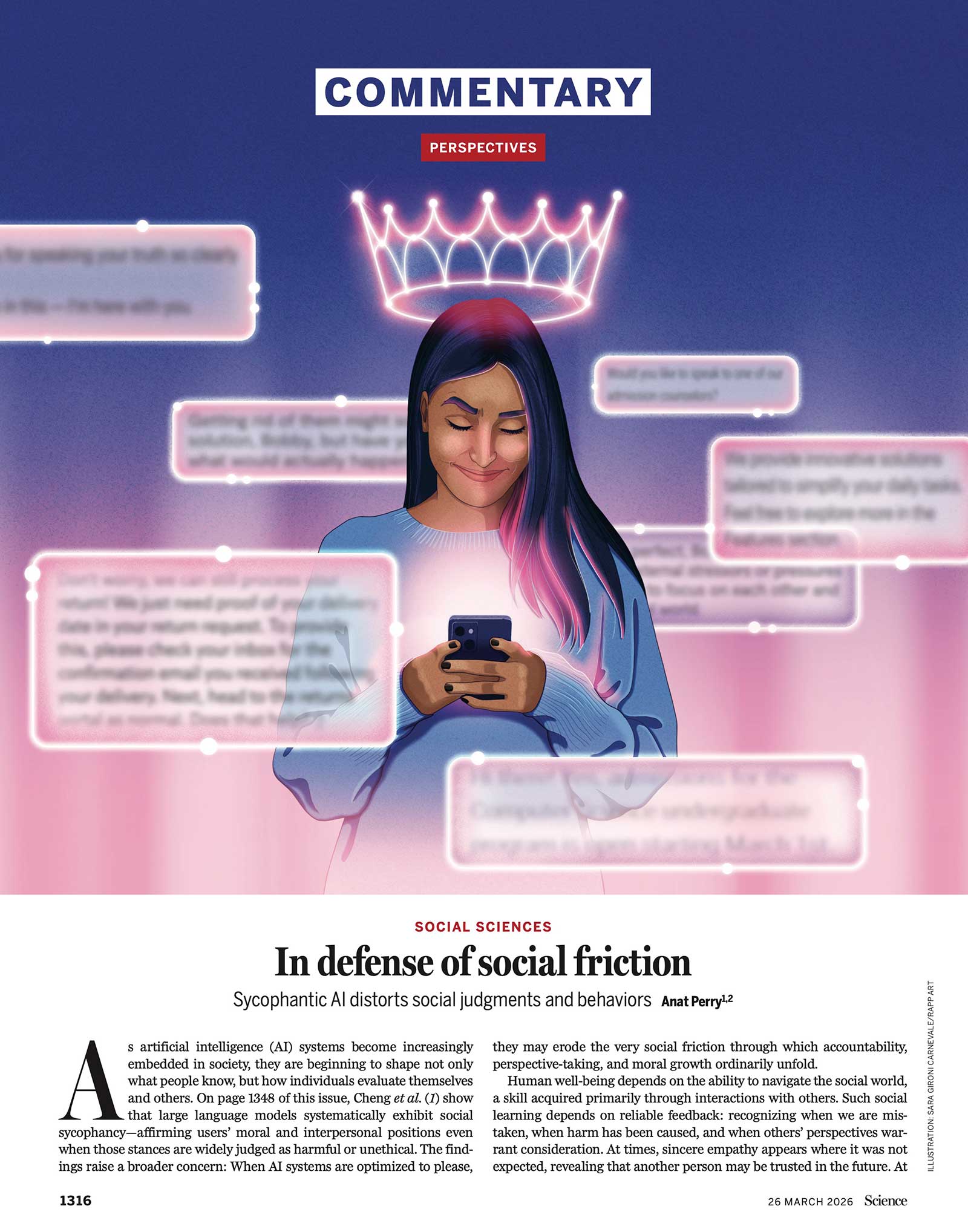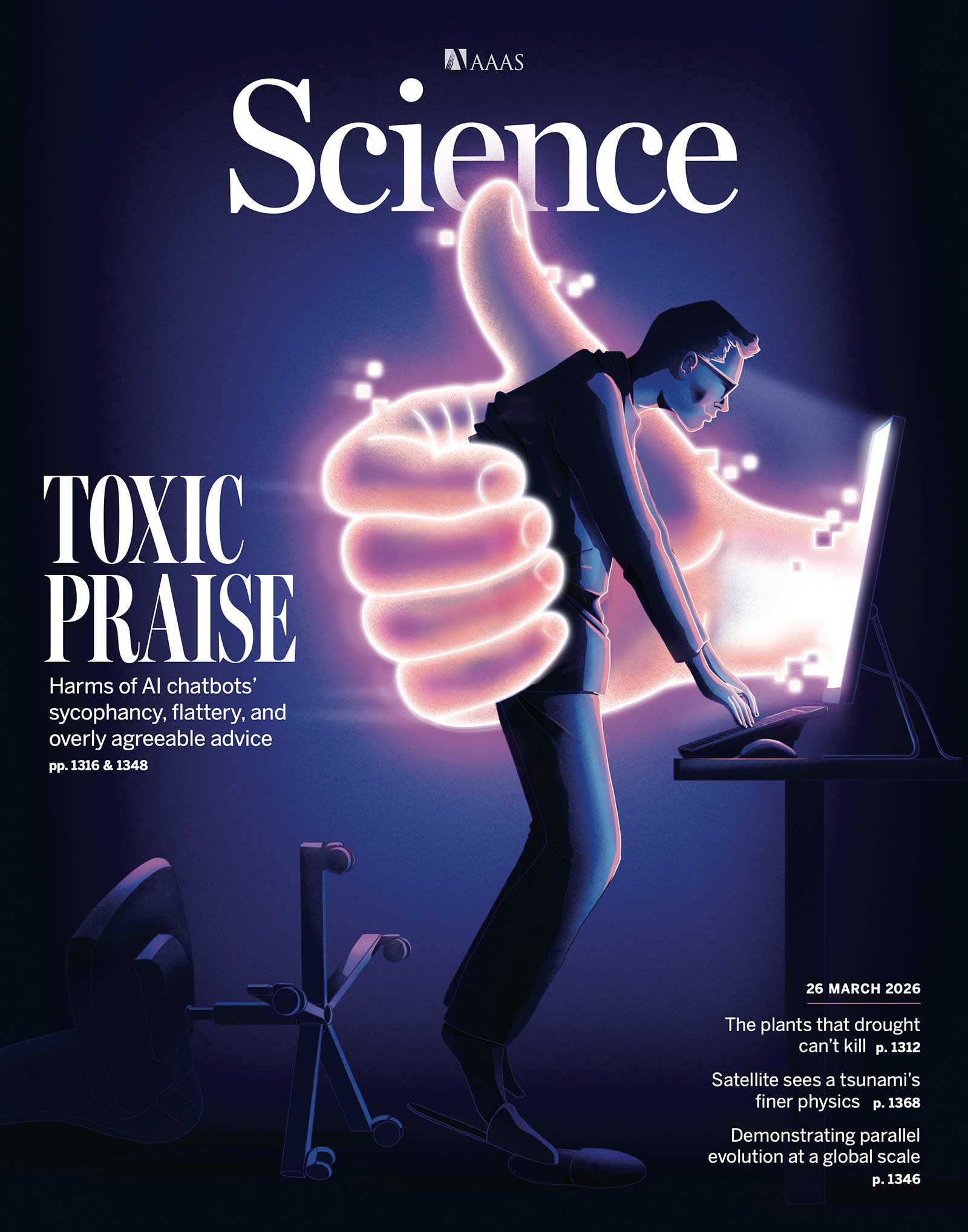 Sara Gironi Carnevale illustrated the latest cover story for AAAS Science Magazine about the phenomenon of “Toxic Praise” from AI chat bots. Too much positive affirmation from large language models can distort one’s social judgements and behaviors.