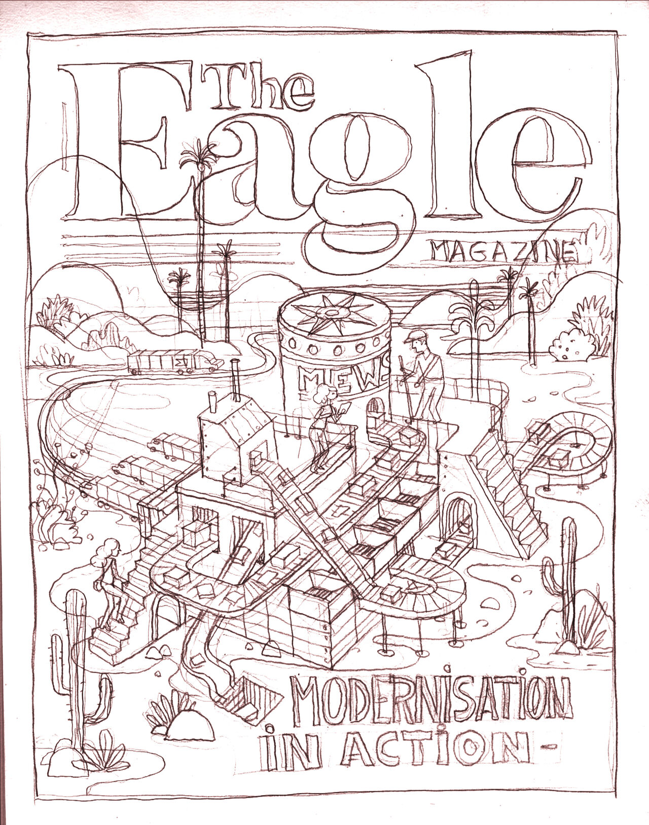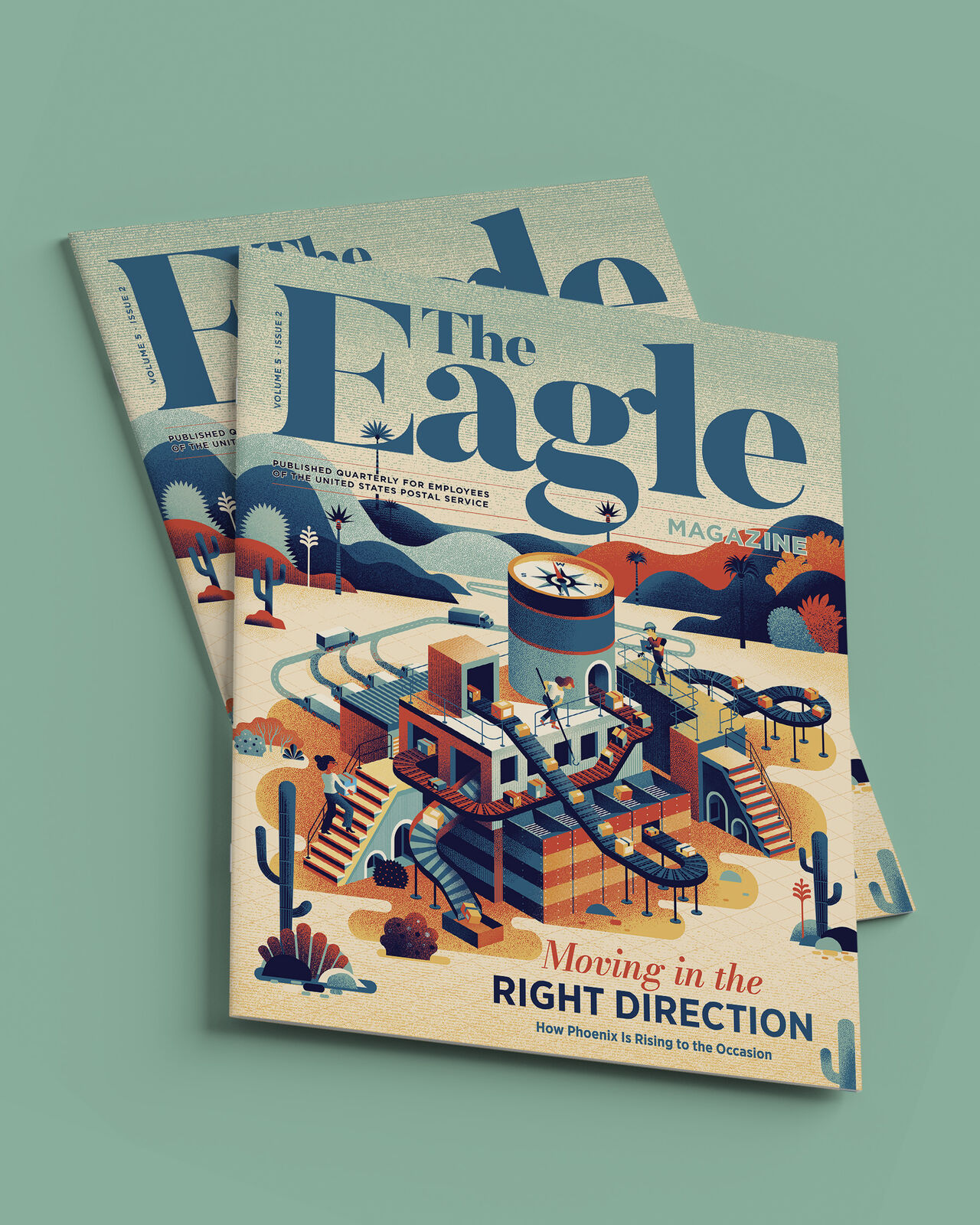 Gwen Keraval illustrated the latest issue of The Eagle, the quarterly magazine of the US Postal Service. Gwen’s illustration is a conceptual depiction of the regional transfer hub in Phoenix, which is at the forefront of USPS logistical modernization efforts.