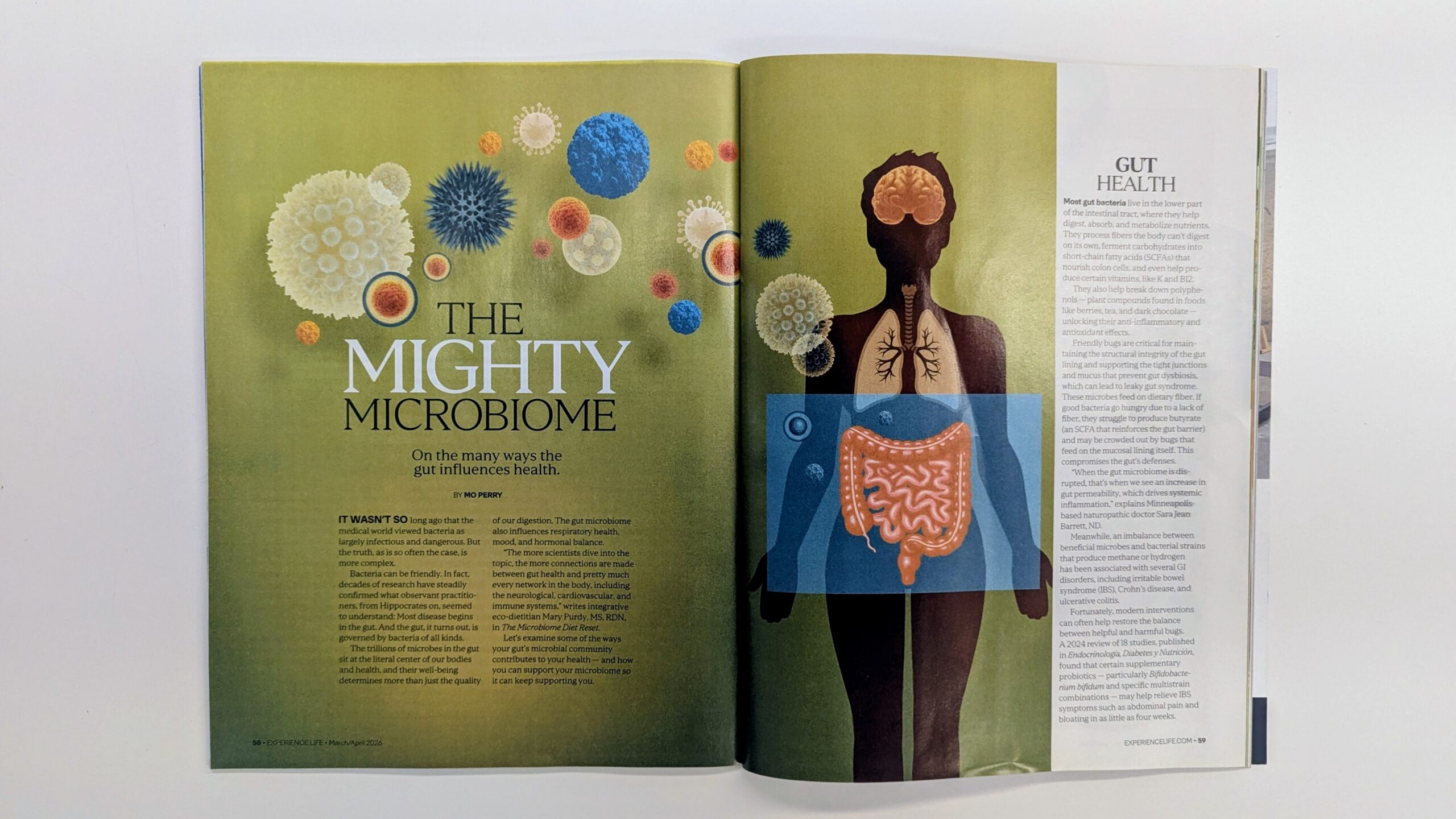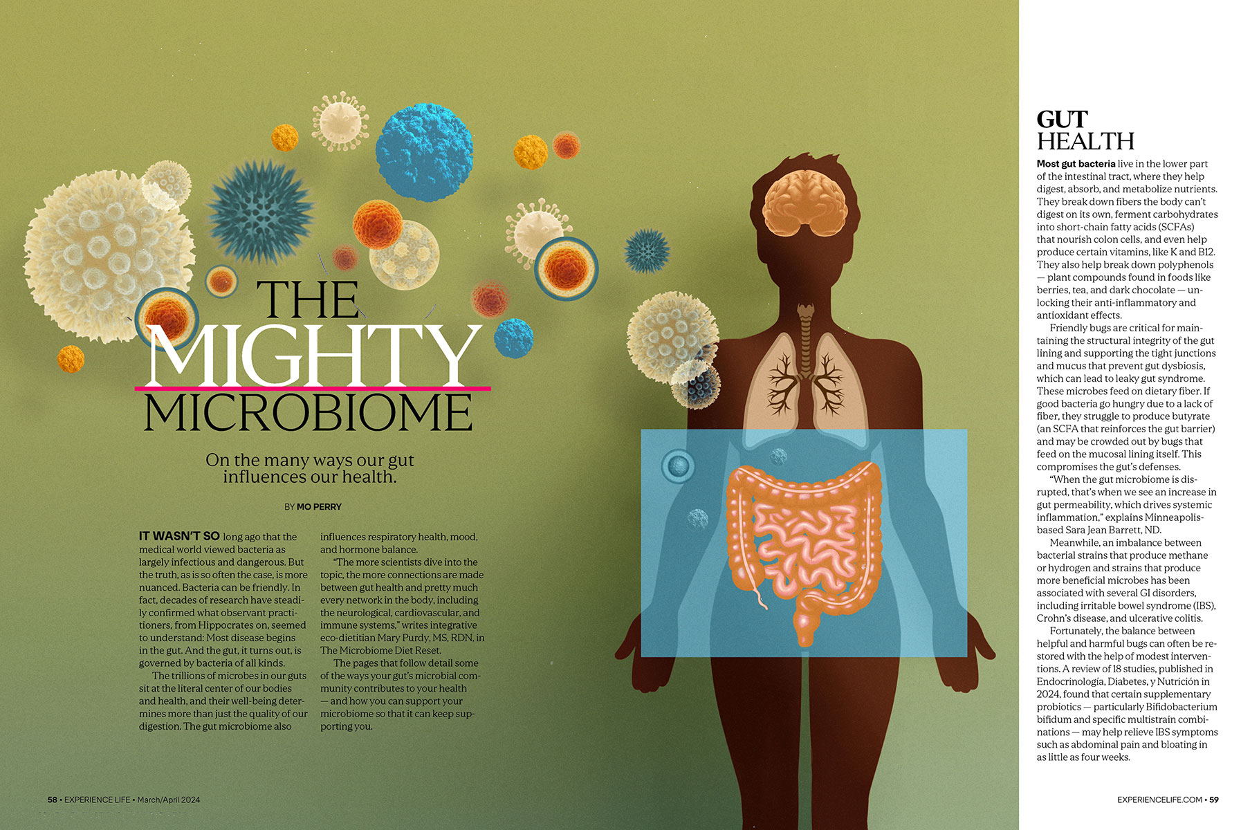 Stuart Briers illustrated an article in Experience Life Magazine’s The Food Issue about how the gut microbiome influences respiratory health, mood and hormonal balance.