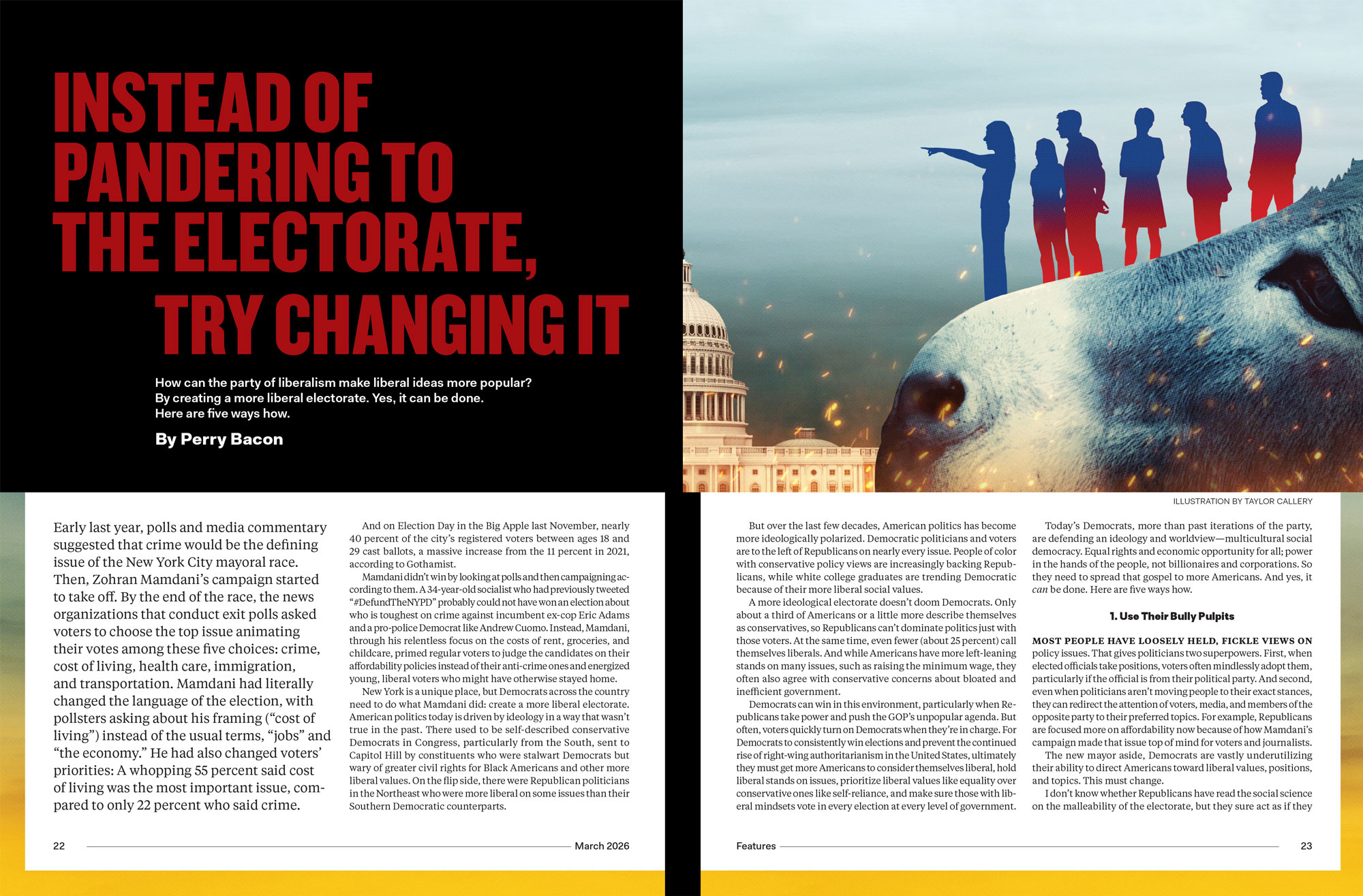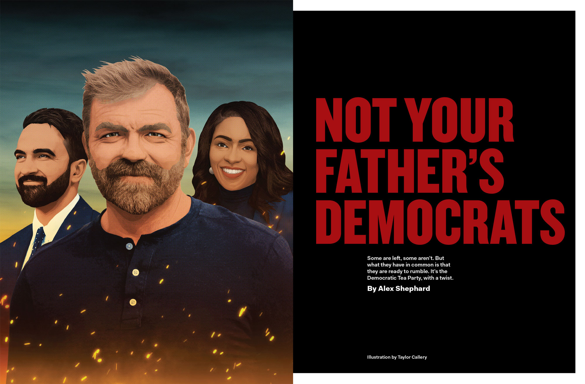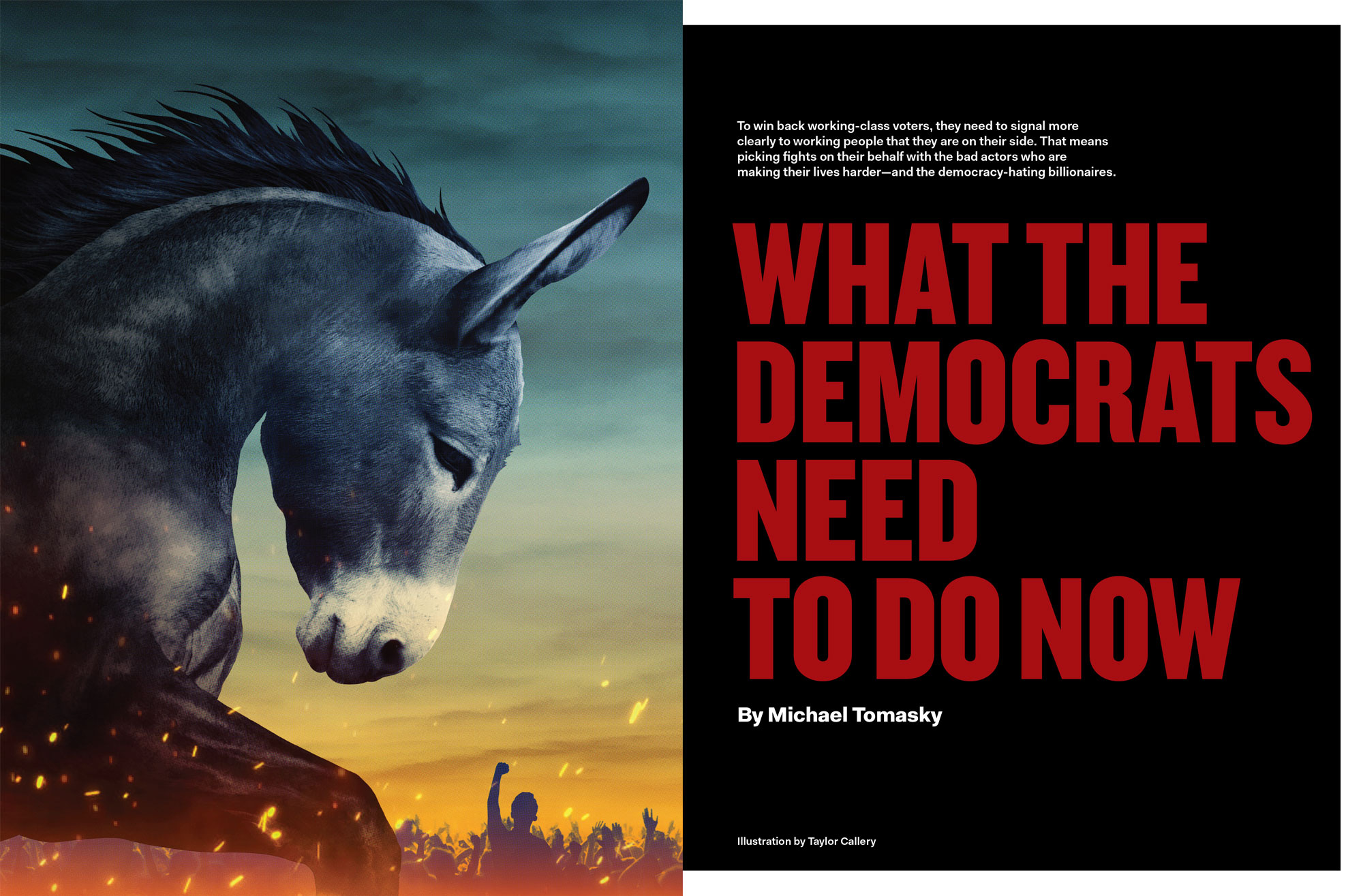 Taylor Callery illustrated a package series for a special issue of The New Republic, containing a series of articles on new strategies for the Democratic party. Thanks to Art Director Andy Omel
