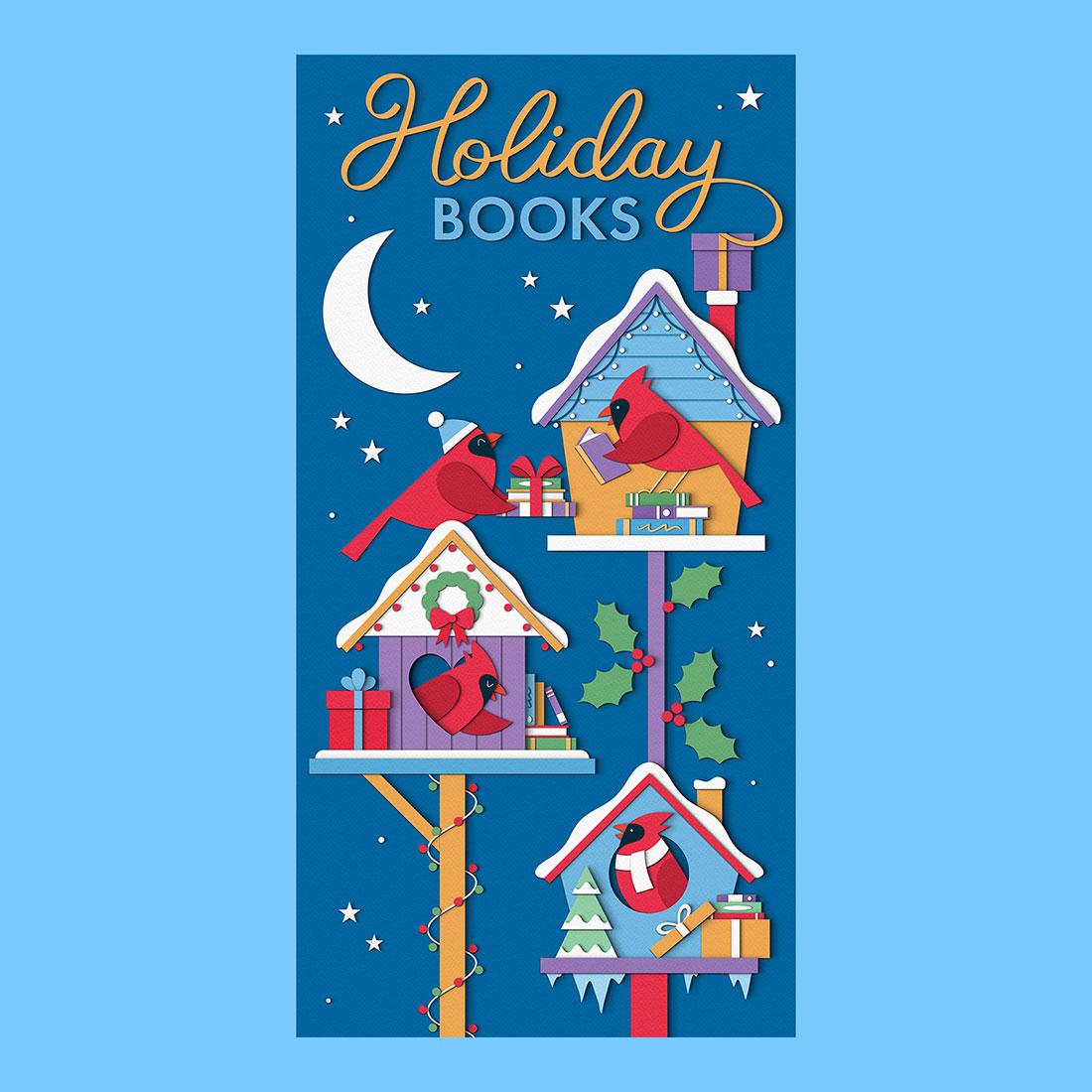 Zara Picken was commissioned to illustrate the Wall Street Journal’s Holiday Books feature, their annual gift guide for readers of all kinds. Zara created an animated banner as well as section badges for the book categories, all tied together by the playful cardinal characters throughout.