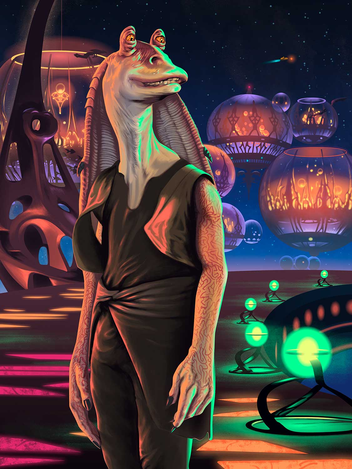 Pete Lloyd worked with Fanatics Collectibles to illustrate Topps Chrome series Star Wars trading cards in collaboration with Lucasfilm. The five collectible cards feature iconic Star Wars characters, scenes and symbols in blacklight-inspired colors.
