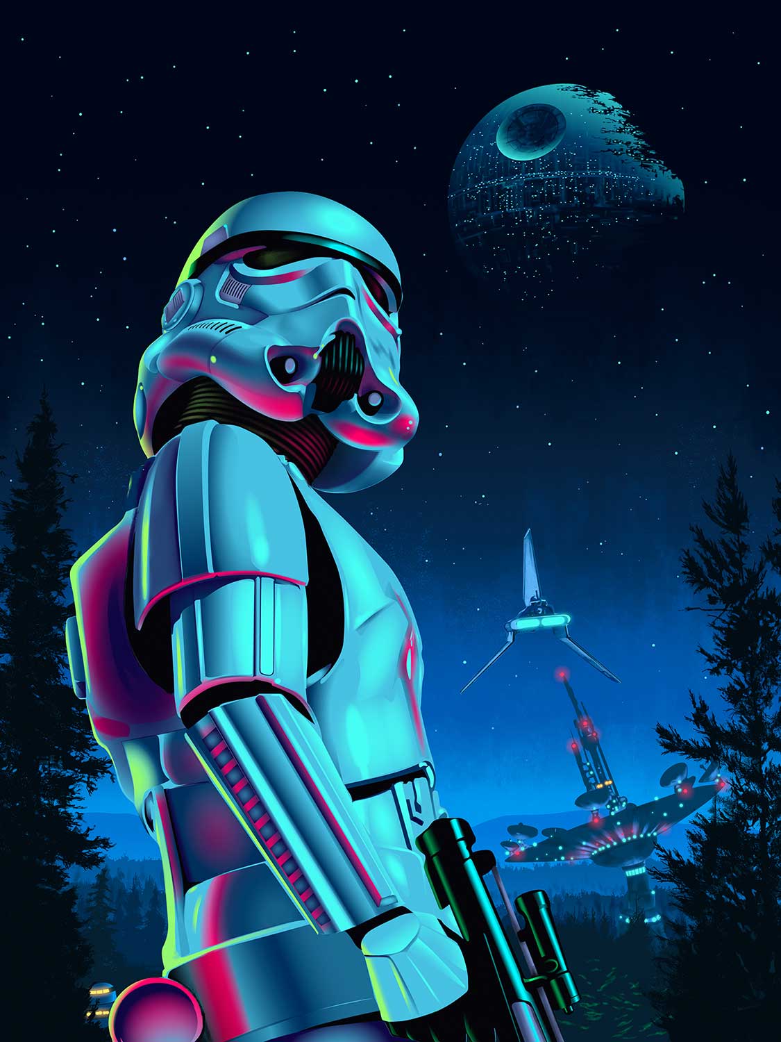 Pete Lloyd worked with Fanatics Collectibles to illustrate Topps Chrome series Star Wars trading cards in collaboration with Lucasfilm. The five collectible cards feature iconic Star Wars characters, scenes and symbols in blacklight-inspired colors.