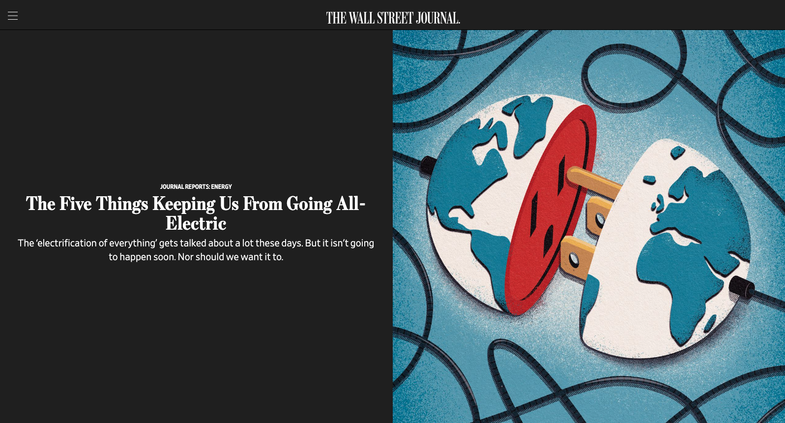Mike Ellis illustrated “The Five Things Keeping Us From Going All-Electric” in the Wall Street Journal’s section on energy reports. The electrification of everything isn’t happening anytime soon, nor would it solve our energy problems if it did.